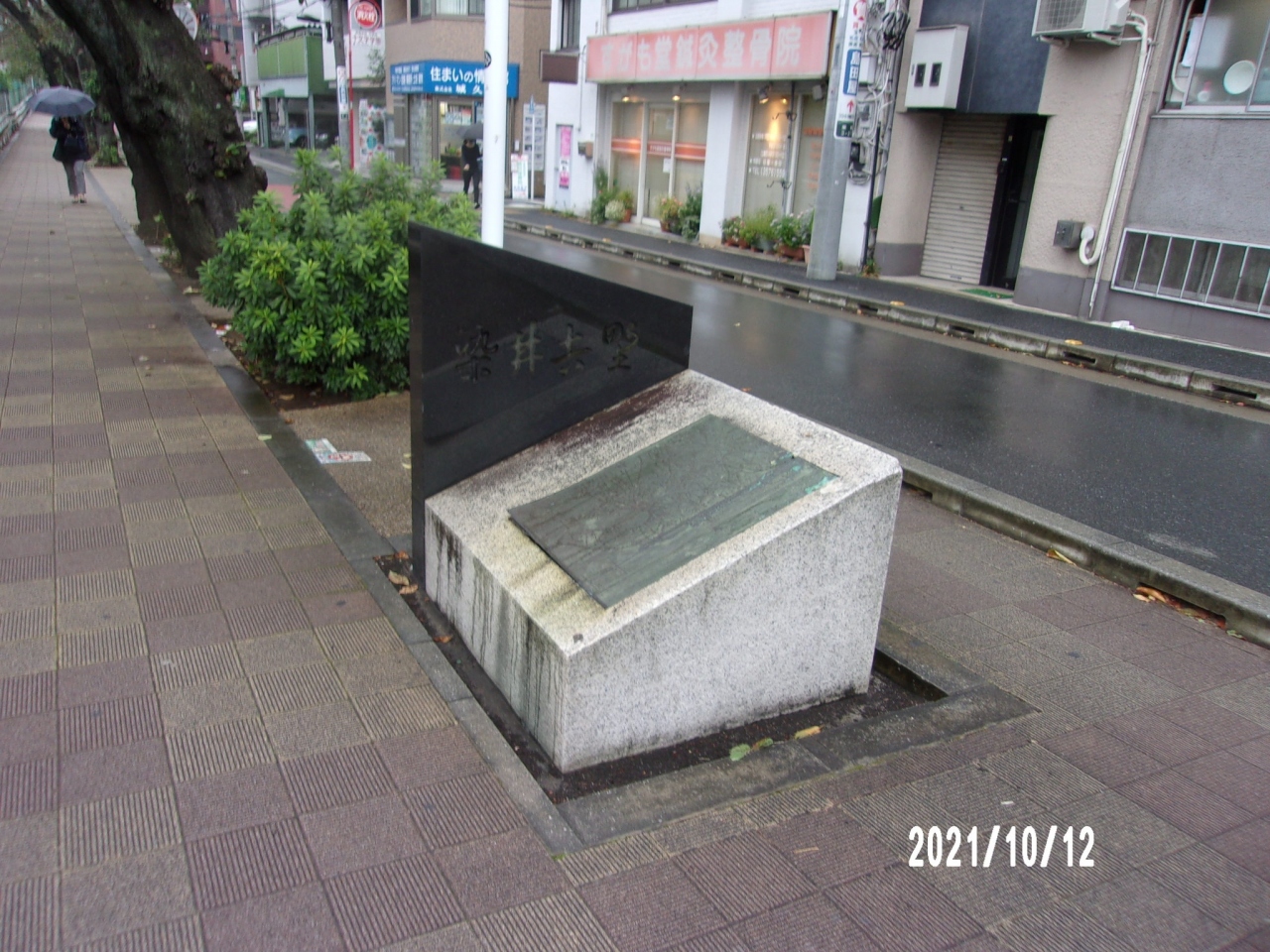 この染井吉野の碑はJR山手線巣鴨駅西口から出て白山通りを超えると山手線沿いの遊歩道になります。山手線と白山通りが交差する橋のたもとにあります。意識しないと見逃します。碑は名前が刻まれた石と染井のエリアの地図が刻まれた石とでつくられています。