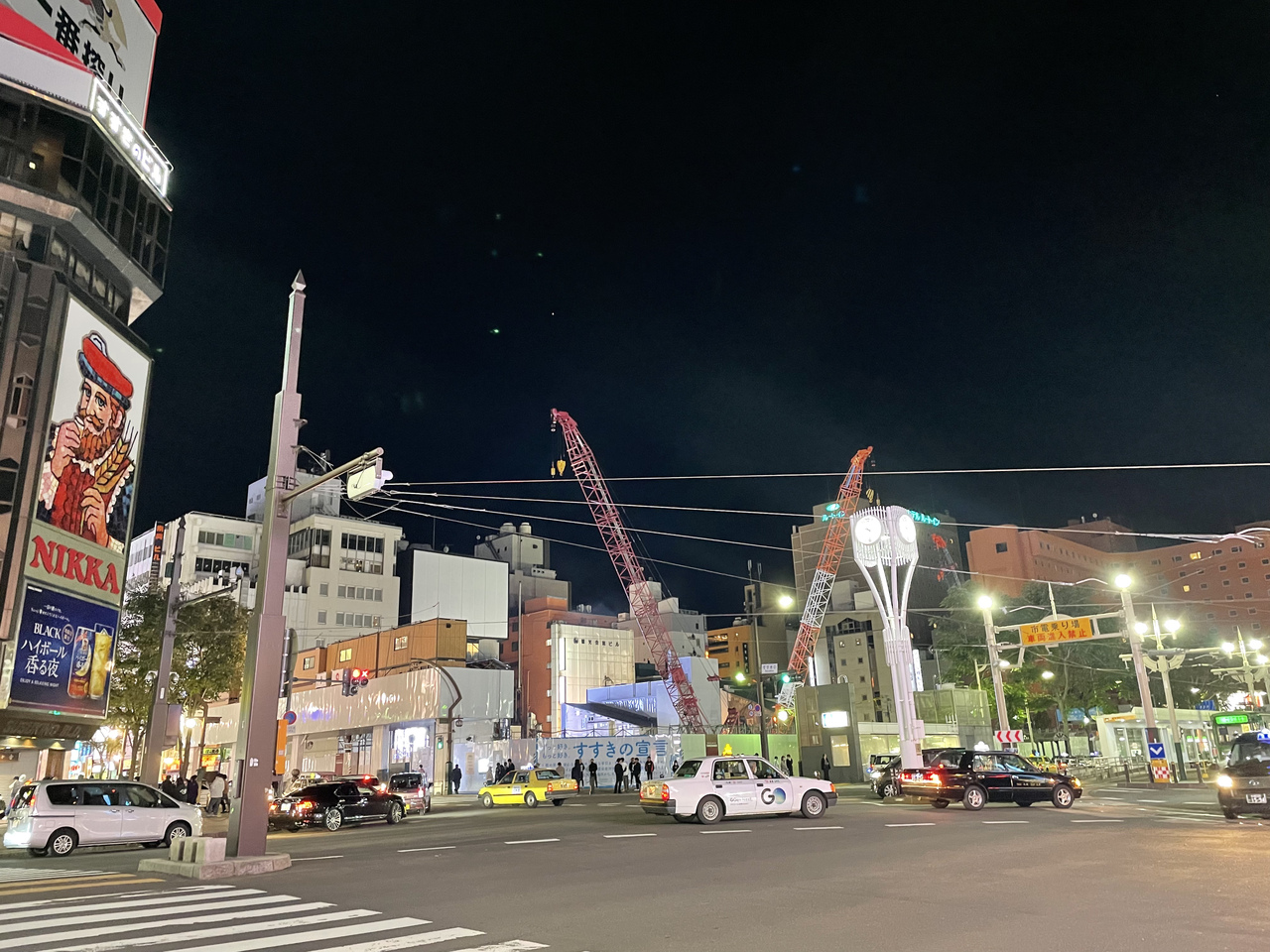 札幌を代表する繁華街。10月の週末は、緊急事態宣言明けで結構な人出でした。夜遅くはほとんどの店が閉まってしまい、数少ない営業店に客が集中していました。すすきの交差点の一角は工事中で、また新しい顔を見せてくれるのでしょうか。