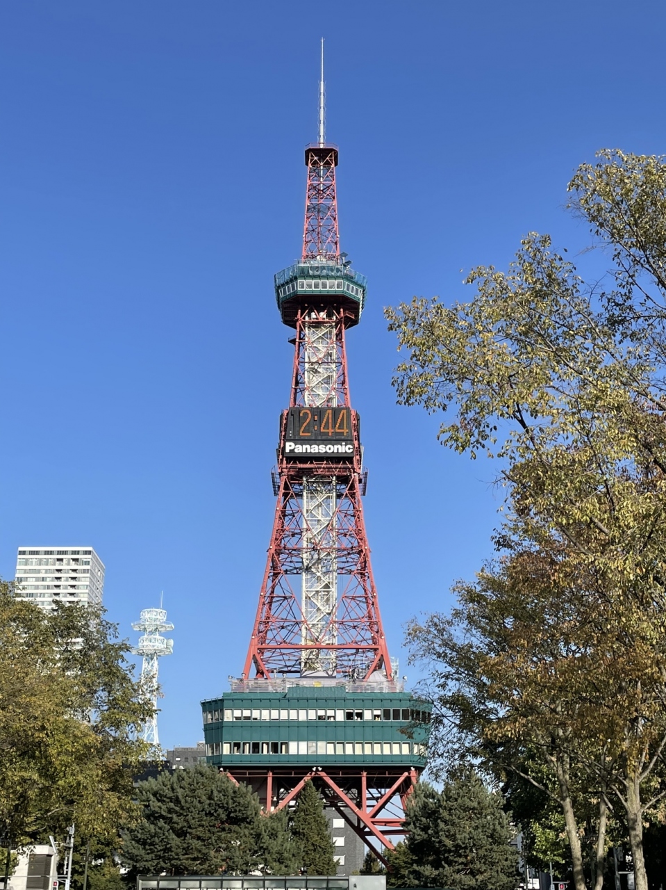 大通公園の東のはずれに立つ札幌のシンボルタワーです。市内、特に大通公園からはどこからも目に入り、大きなデジタル電光時計も写真に写り込めば、いい記念になります。碁盤の目の東西南北の中心地点でもあります。