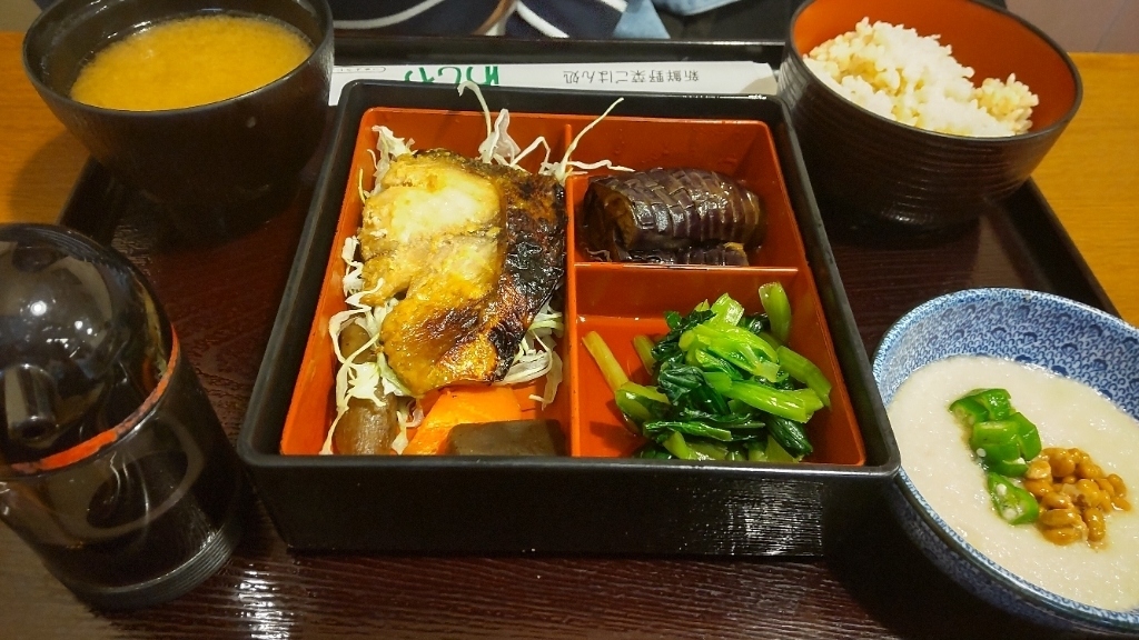 芽ぐみ米定食は西京焼きに茄子の煮もの、そして納豆ととろろの小鉢が付いている。