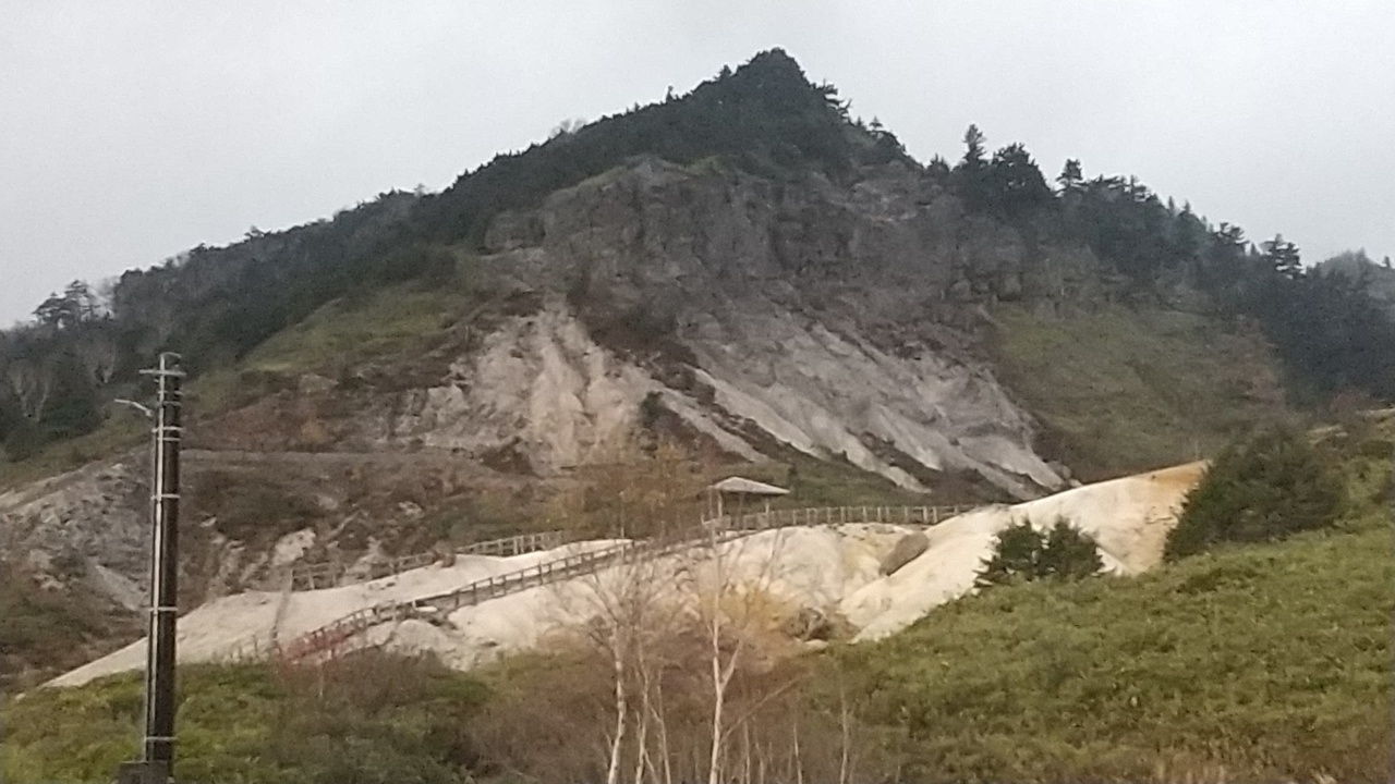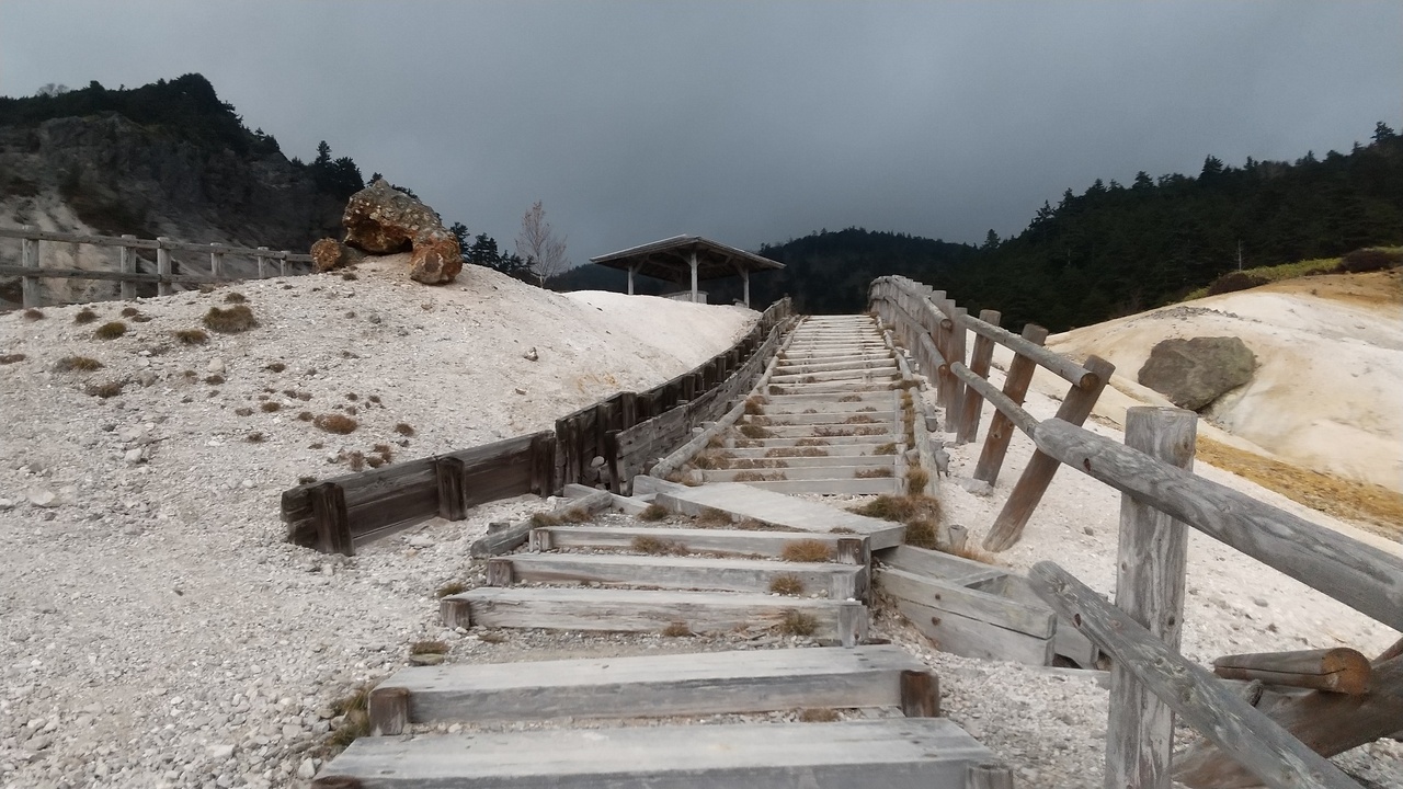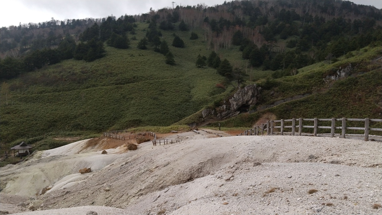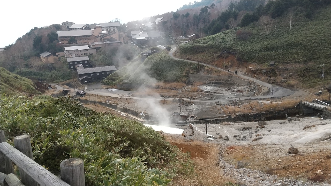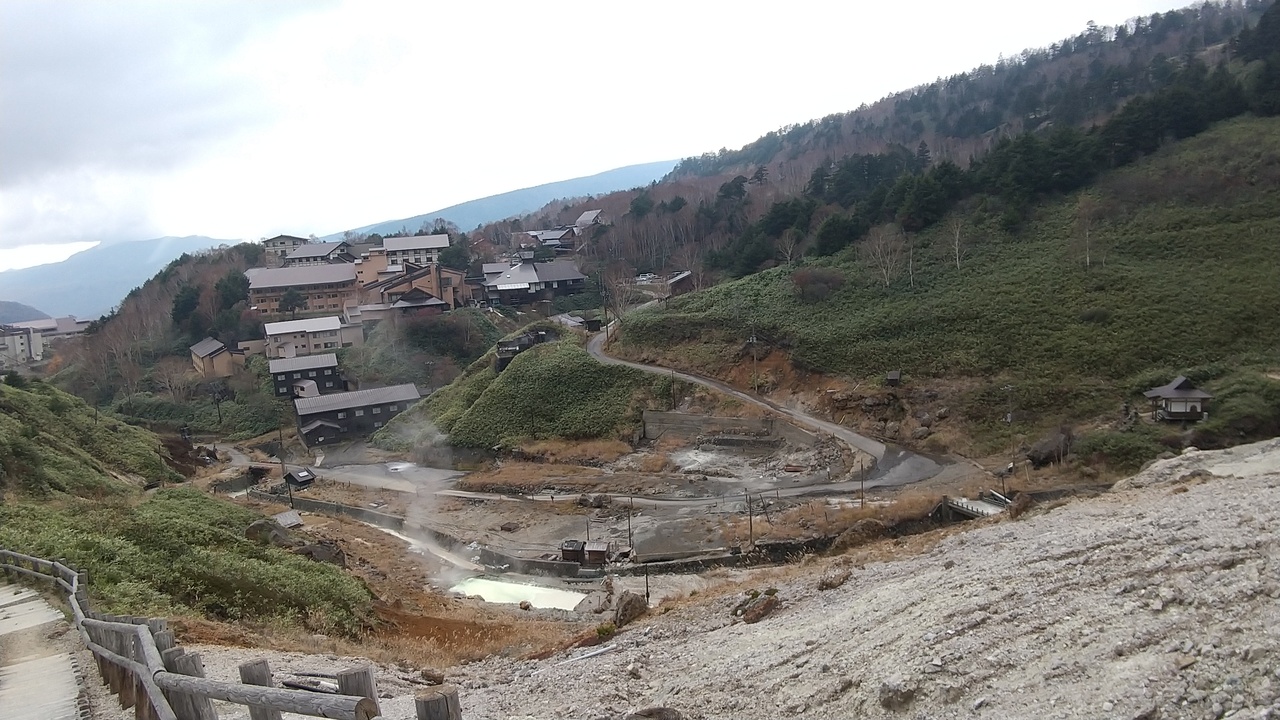 今回の湯畑見学は駐車場があり散策路が整備されている場所から行き山の上から湯畑を見学。