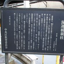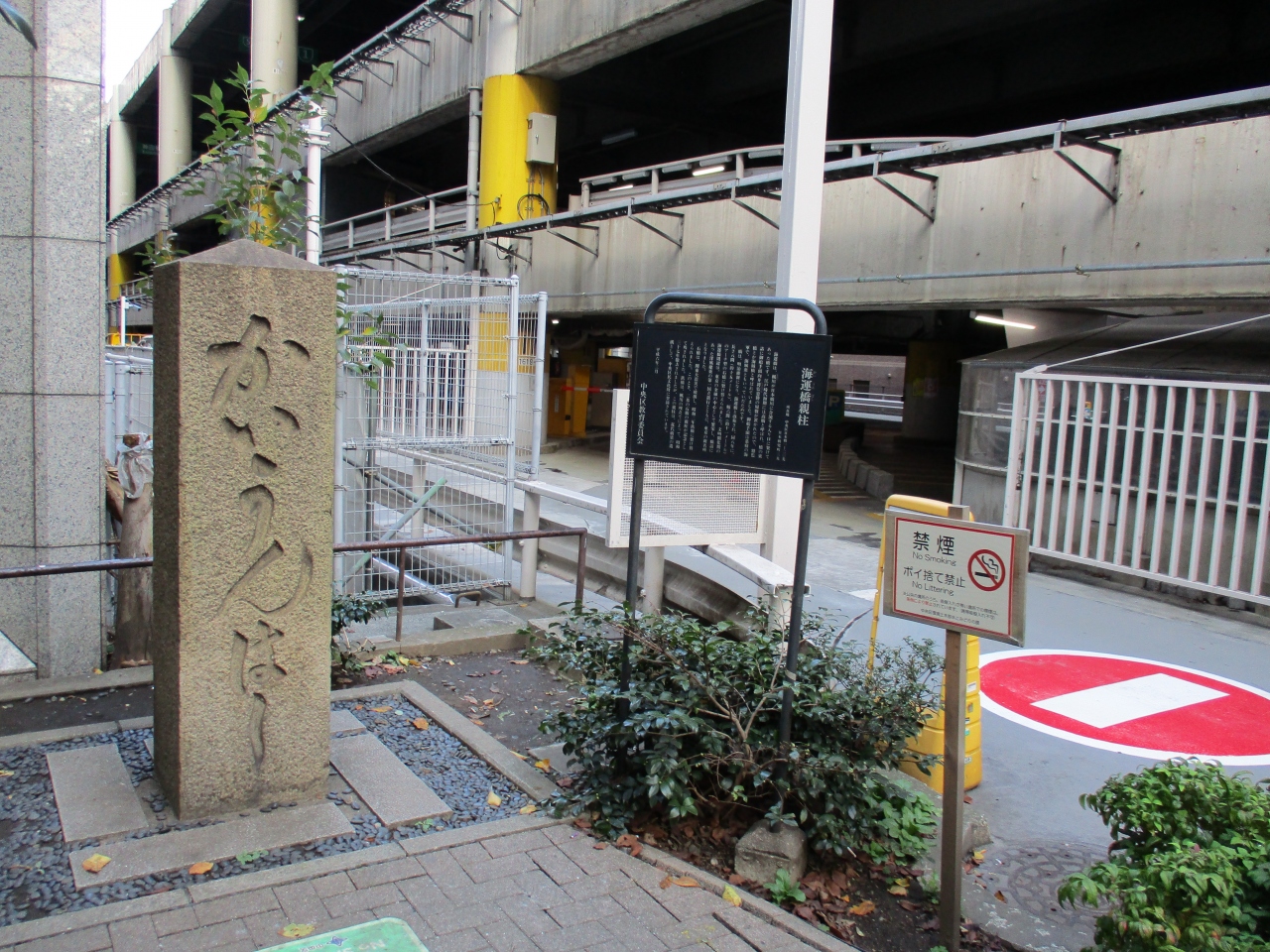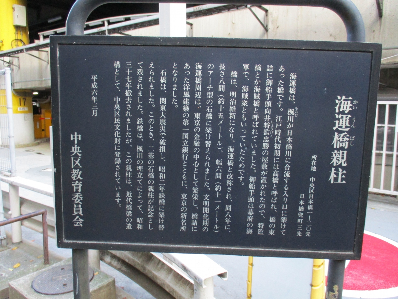 日本橋から兜町方面に散歩をしていて、道路わきに案内表示板が立っているのに気が付きました。この場所に海運橋があった記念の案内板でした。今は川も埋め立てられて、親柱だけがポツンと残っているので、ちょっと寂しい気がしました。