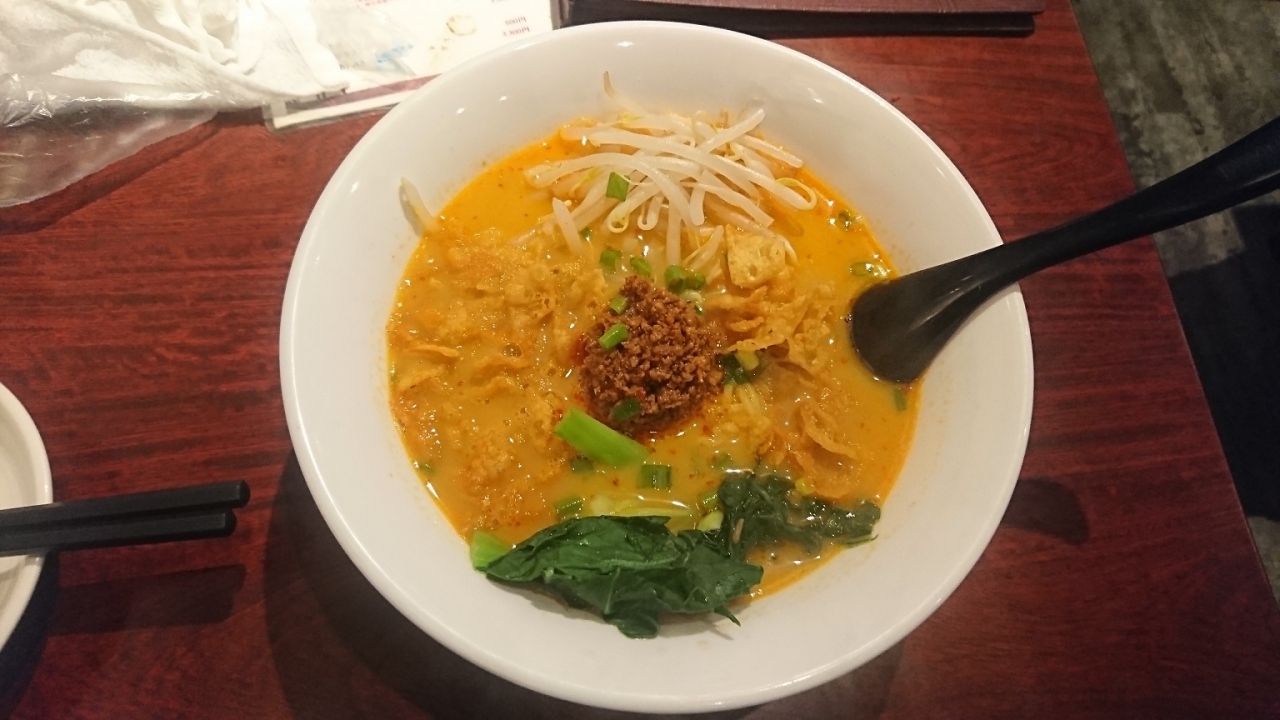 港区高輪3丁目の第一京浜道路沿いのビルの地下1階に有る中華料理レストランです。夕食で胡麻担々麺をいただきました。具はモヤシ、肉のミンチ、青菜、雲吞の皮を揚げたようなもの、ネギで、スープは胡麻風味で辣油の浮いた橙色のスープ。辛さはほとんど感じず、山椒の痺れも無く、旨みも少ない感じで物足りないスープでした。