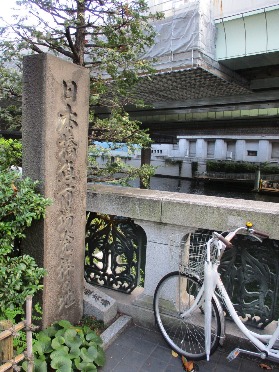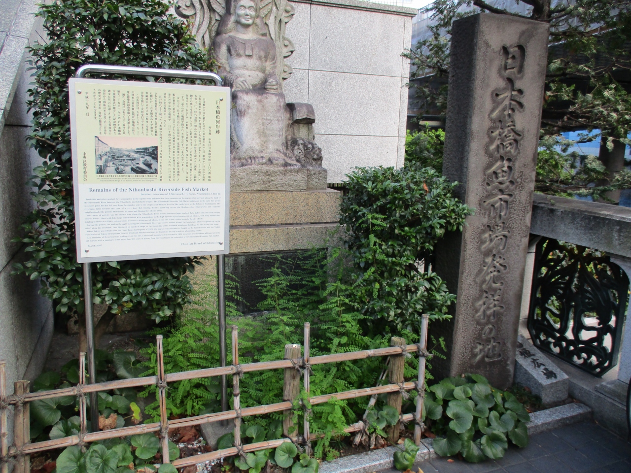 日本橋の脇に、江戸時代からこの場所に魚河岸があったことを記念した案内表示と、石碑が建っていました。今は護岸がコンクリートで固められていて、川のそばまでいけません。当時は船で運ばれてきた魚などが、この場所から陸揚げされて、きっと賑やかだったろうと思いました。