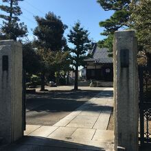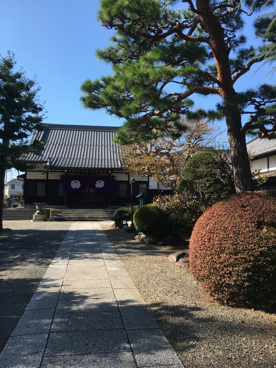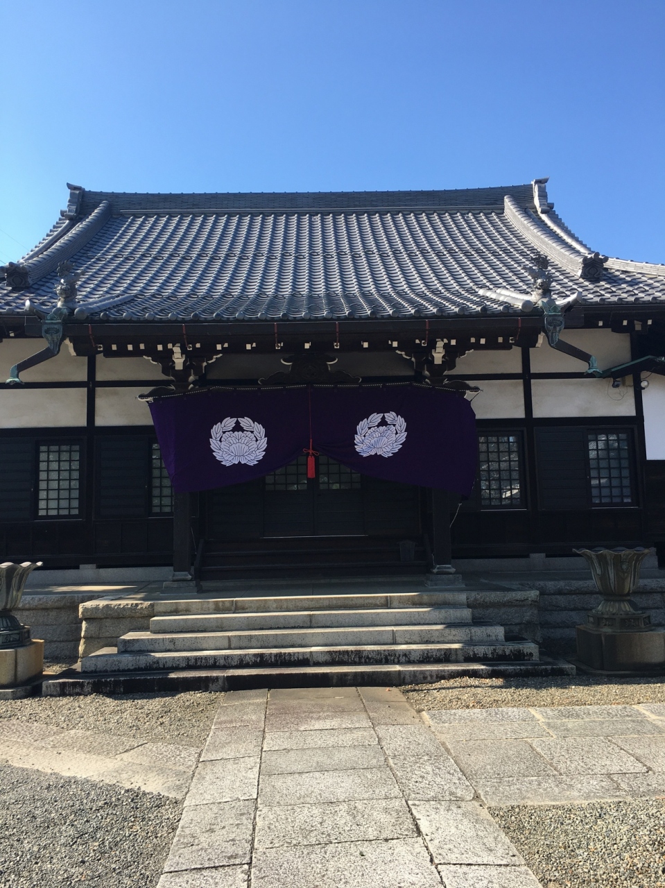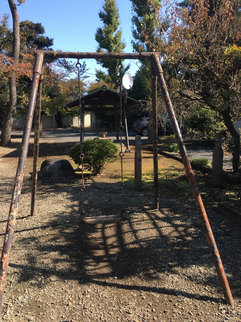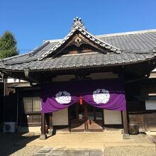 境内入ると空間があり、左側にはトイレがありました。本堂は大きく、左側にはお墓がありました。お墓の前に古びたブランコと鉄棒がさりげなくあるのが良い雰囲気を醸し出していました。本堂は紫の垂れ幕が掛かっていました。