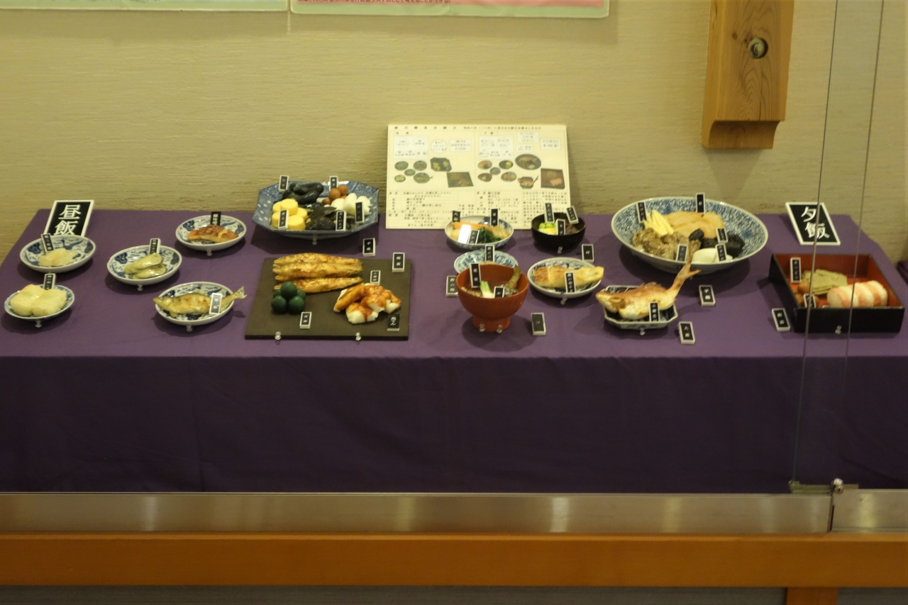 展示は、おしゃぎり会館が武家文化を中心としているのに対し、こちらは人々の衣食住に力を入れています。特に、食事に関する物の再現が充実しており、カラフルで親しみやすい内容となっています。