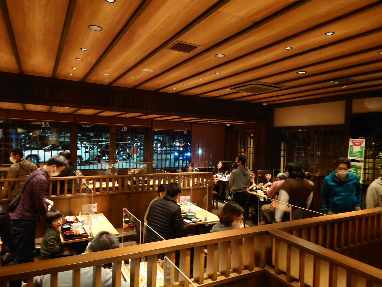 フードコートなどに寄ってもらうために近くにトイレを置くことが多いが、こちらでは敢えて遠くにも作っている。江戸時代風の建物と内装が人々を引き寄せ、寄りたい人はたくさんいて中は大変にぎわっていた。
