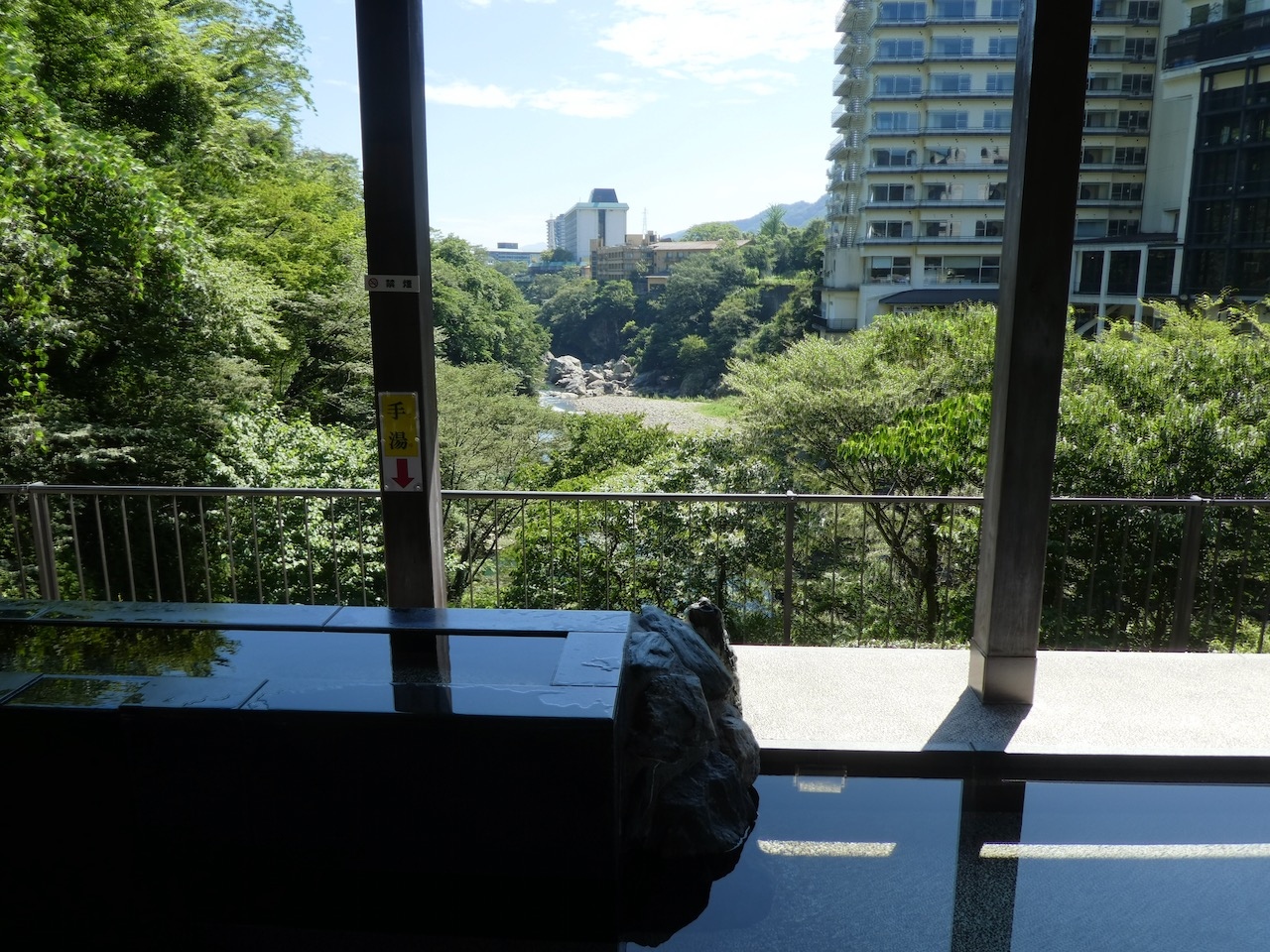 この足湯は駅前の足湯とちがってほとんど人の姿がありません。それでいてすばらしい眺め。独占できます。隣には河岸近くまで降りる遊歩道もあります。鬼怒川温泉の散歩にぜひ。