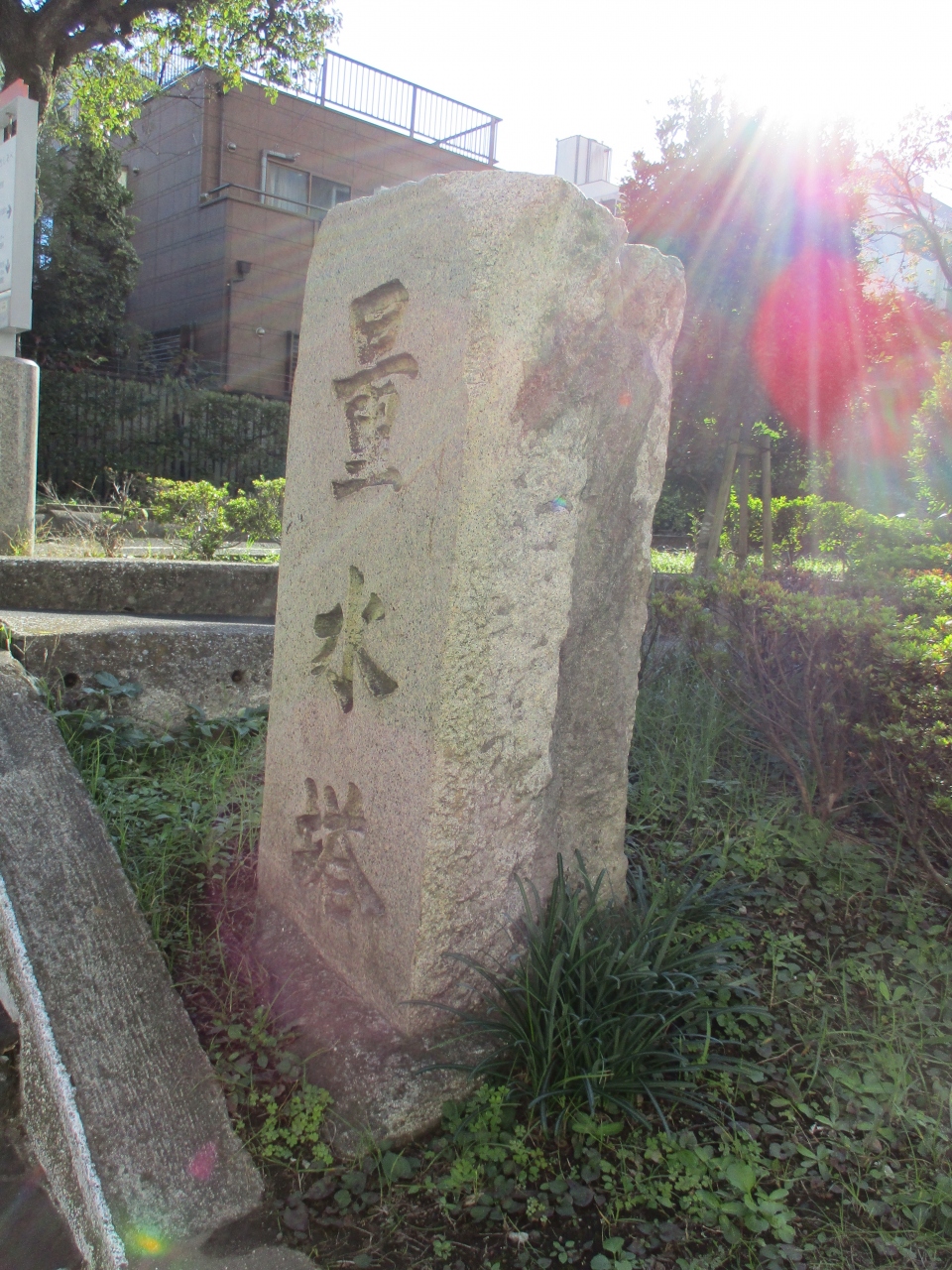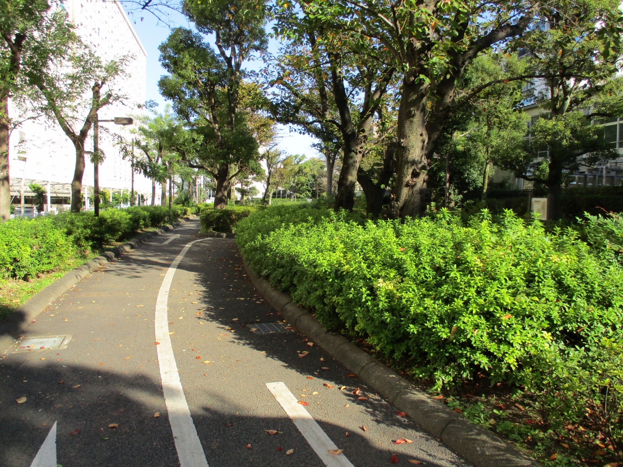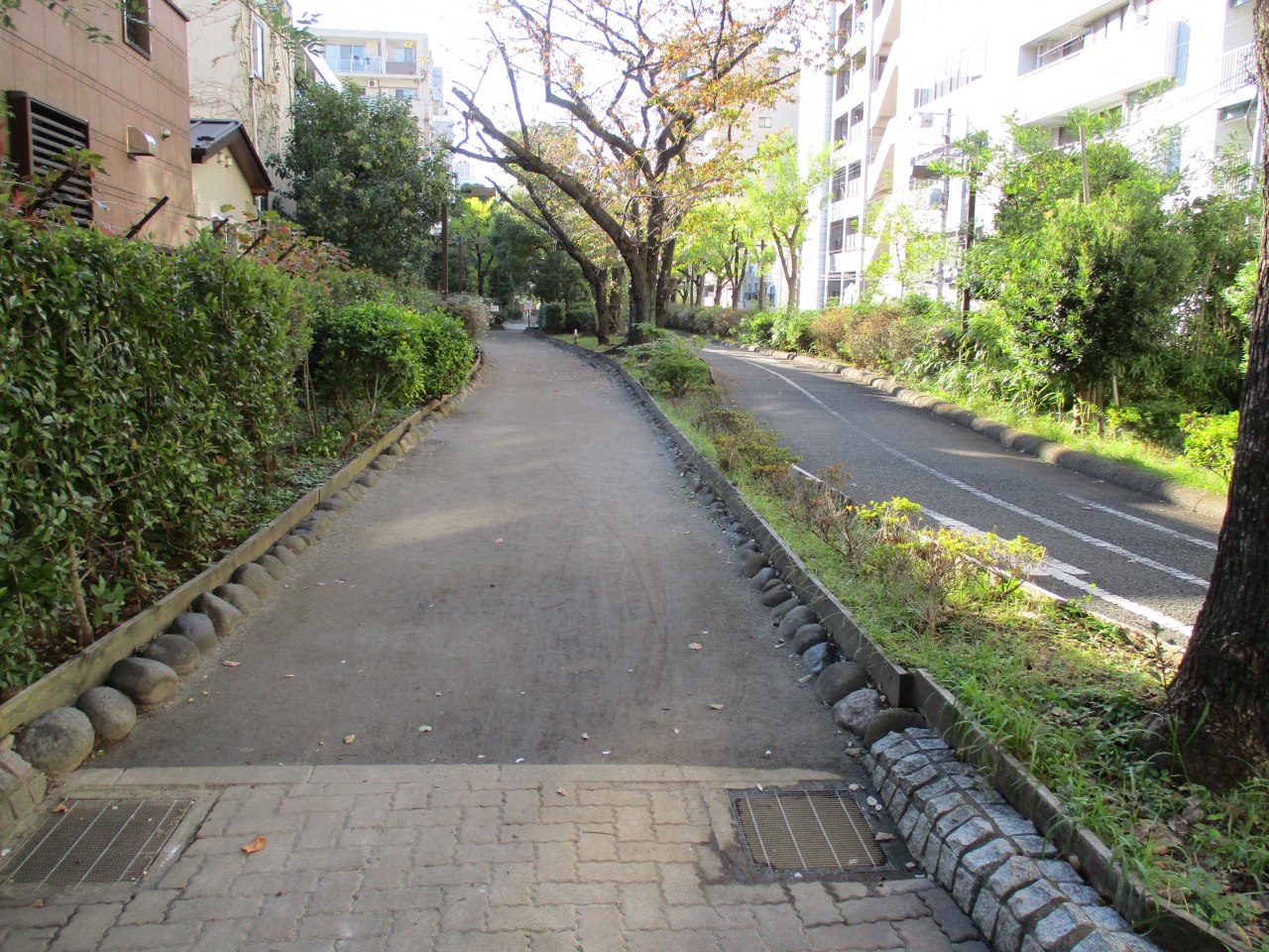 洲崎神社近くから東陽町方面に向かって、永代通りの内側に緑道公園が続いていました。洲崎川緑道公園の名称から、昔は川が流れていたのだろうと思いました。ただ緑道自体が両側から一段高くなっていて、構造的に土手のような気もするような公園でした。途中に量水塔と刻まれた石が置かれていて、残念ながら説明書きもないので役割は不明でした。