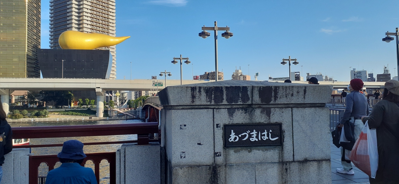 橋の真ん中あたりからは隅田川の水上バス、対岸のスカイツリー、朝日ビールの「う〇こ」のようなオブジェなど浅草を代表する景色が見られました。