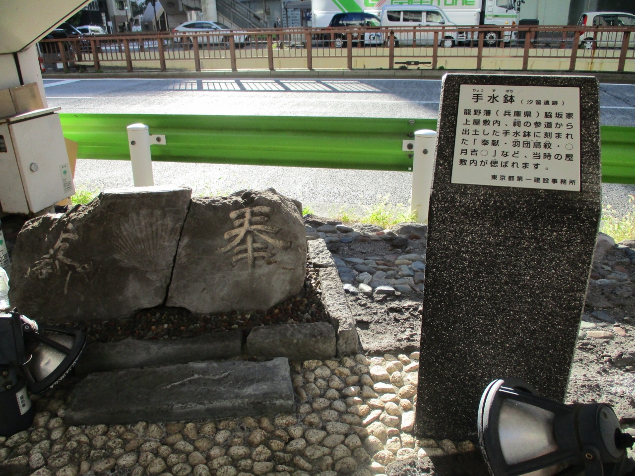 昭和通りと花椿通りにかかる昭和ときめき橋の袂にある遺跡の一つです。こちらは大きな石で、「奉献」と文字があります。そばに説明板があり、兵庫県龍野藩の脇坂家上屋敷内の祠の参道から出土した手水鉢と書かれていました。こちらの橋にはさりげなくいろいろな遺跡があります。