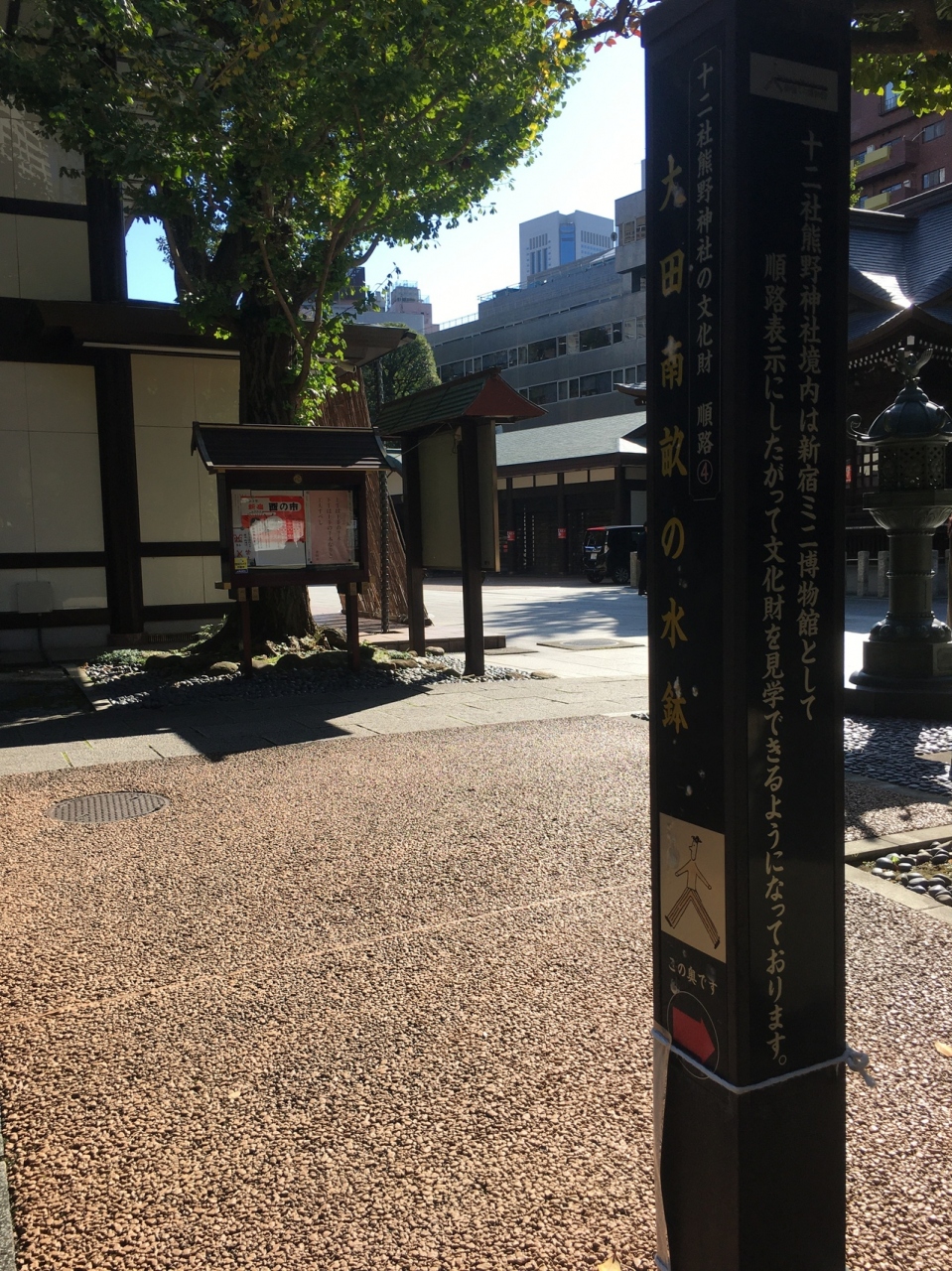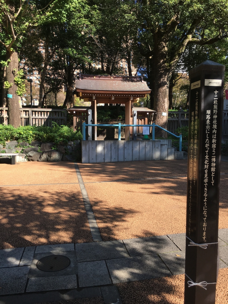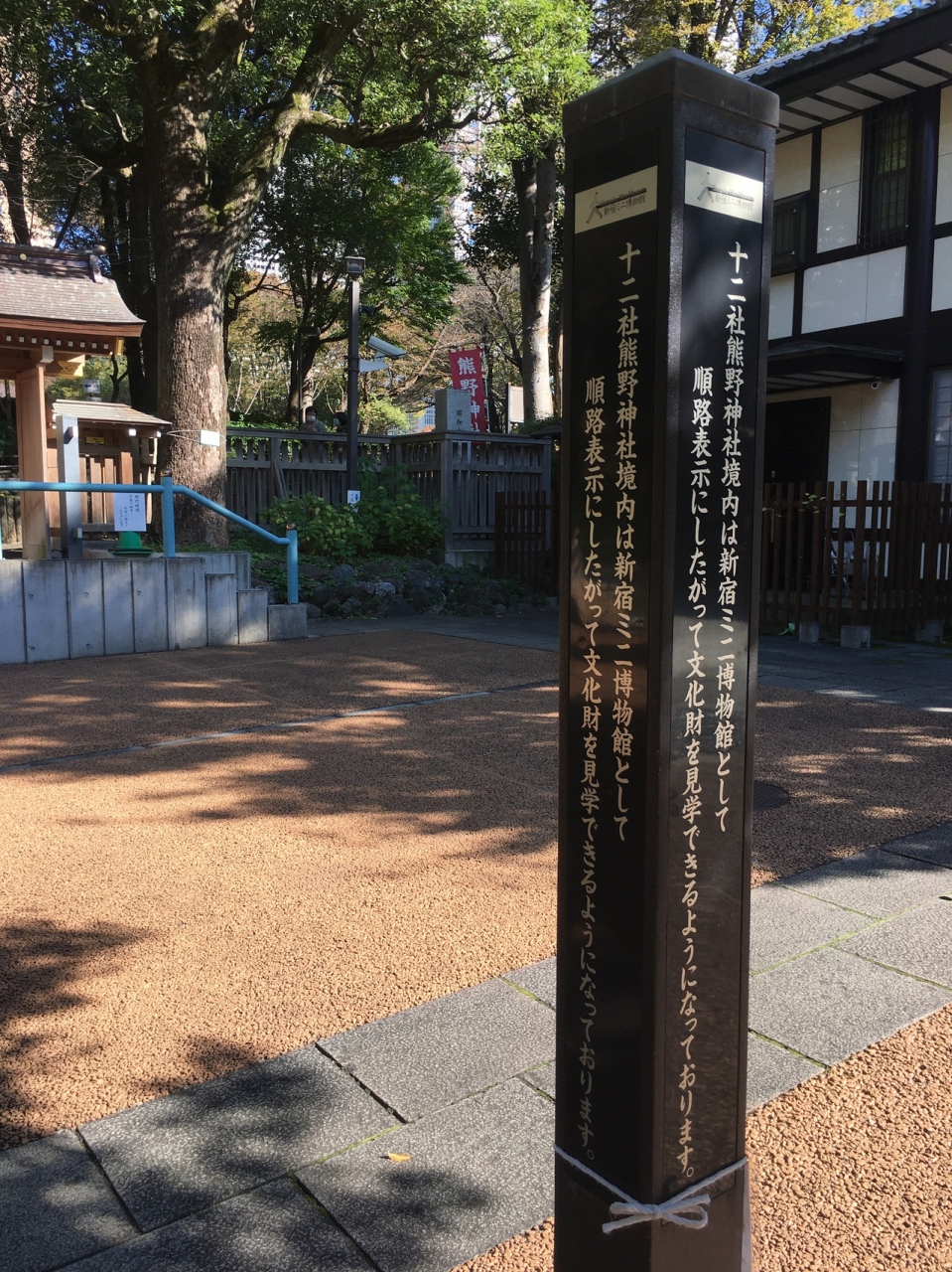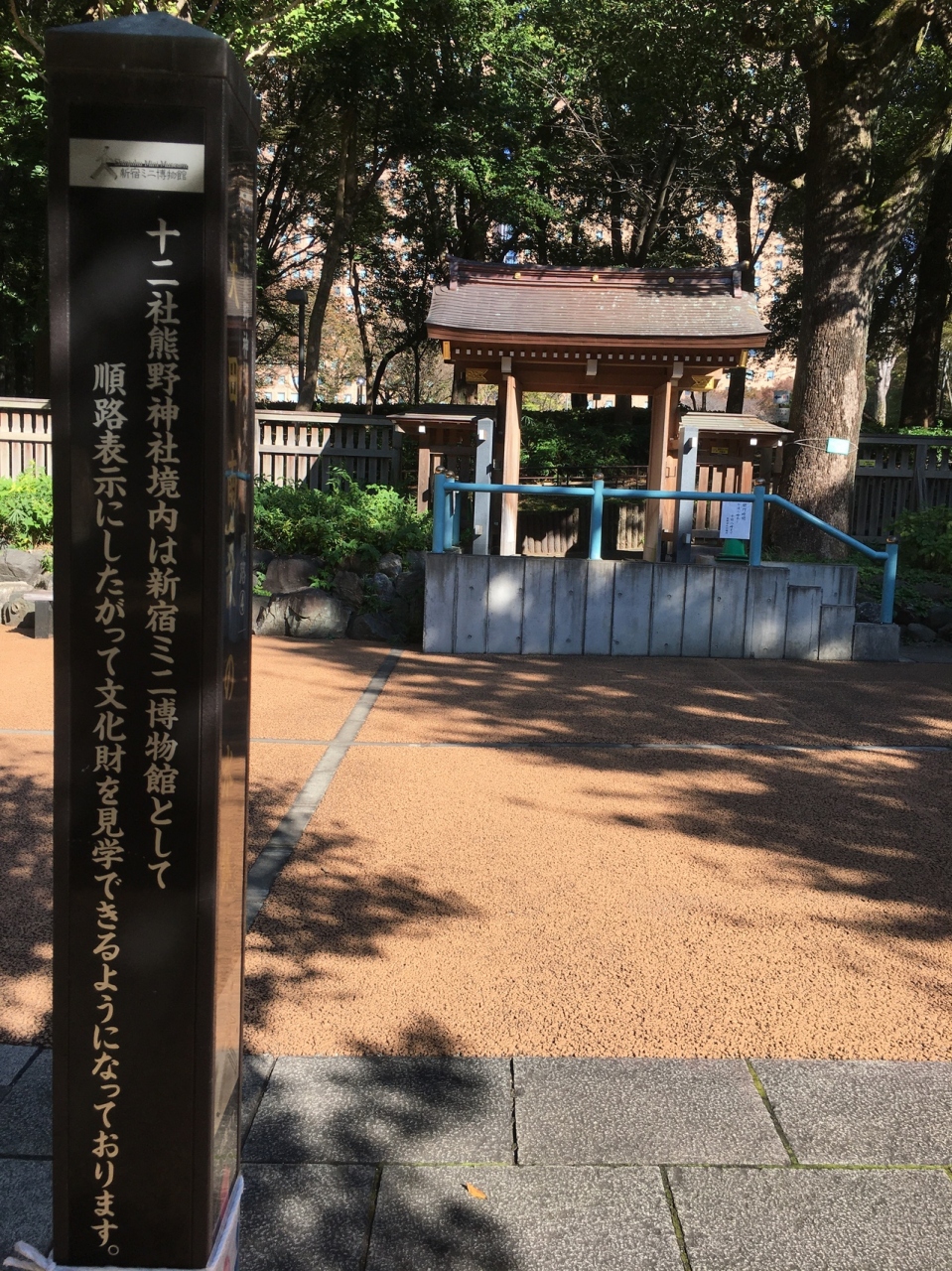 新宿中央公園内の熊野神社の社殿の横にありました。社殿の横には縦長の案内看板があり、目立っていました。1820年に奉納された鉢で、丸い桶を連想していましたが、四角い石の鉢で、横型の桶のようにも見えました。