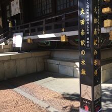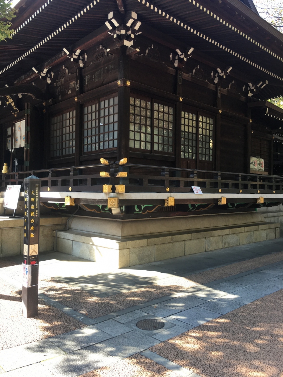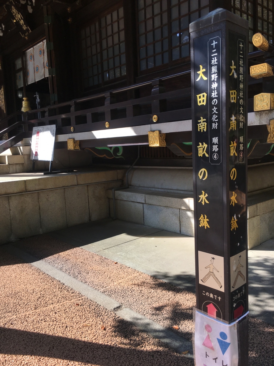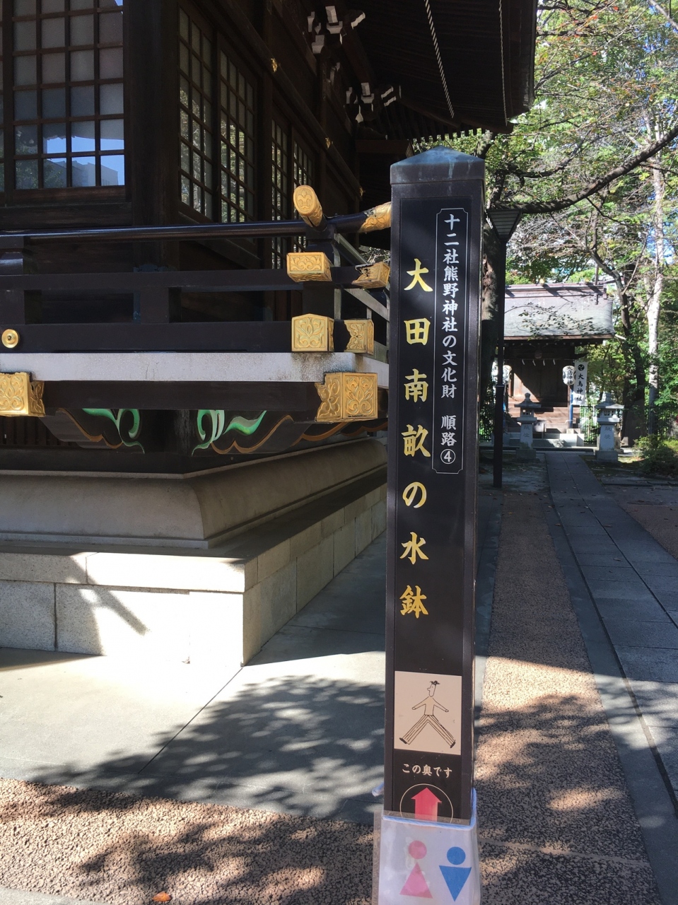 新宿中央公園内の熊野神社の社殿の横にありました。社殿の横には縦長の案内看板があり、目立っていました。1820年に奉納された鉢で、丸い桶を連想していましたが、四角い石の鉢で、横型の桶のようにも見えました。