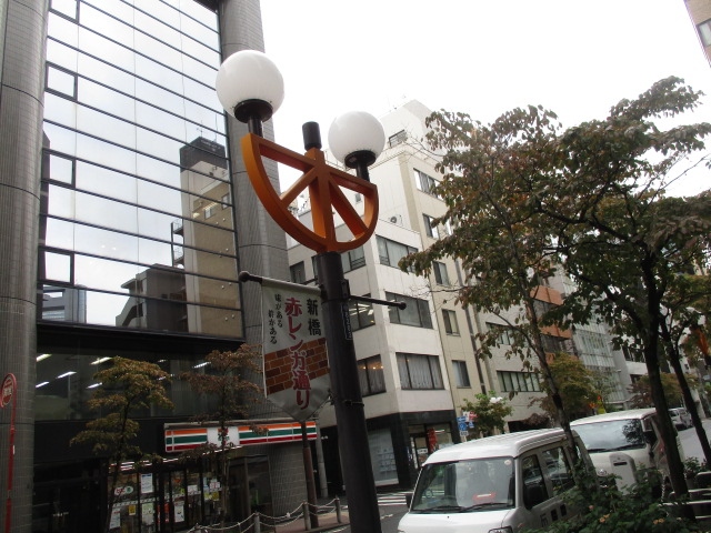 新橋赤レンガ通りは堀商店から愛宕警察署交差点まで1キロぐらいの長い通りです。レンガ通り沿いは雑居ビル群に小さな飲食店、アパレルショップが立ち並んでいました。通りの一部にレンガタイルが敷き詰められていました。機関車の車輪をモチーフにしたオブジェがありました。所々にちょっと明治レトロな雰囲気を感じさせるものがありました。