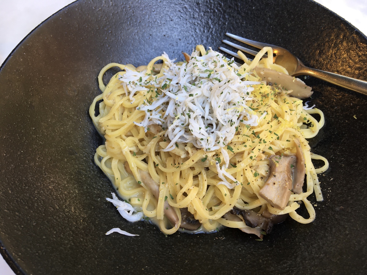 ランチメニューは、いろいろ種類があり、ハンバーガーやパスタセットの他にパエリアもありました。シラスのリングイネを注文しました。レモンクリームが爽やかで美味しかったです。