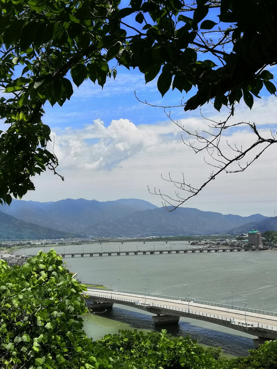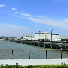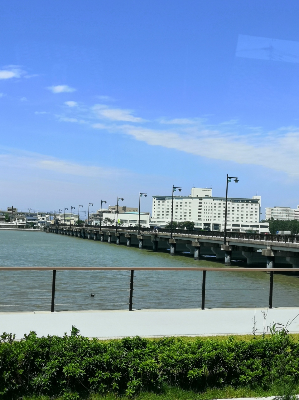 松浦川の河口に架かる橋です。川の幅がぐっと広くなっているエリアにあるので長い橋ですので、唐津城から遠望で見ても見つけることができました。虹ノ松原エリアに南からアプローチするには便利ですが、公共交通機関で唐津を観光する際にはあまり使わないかも。