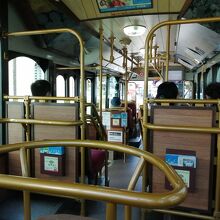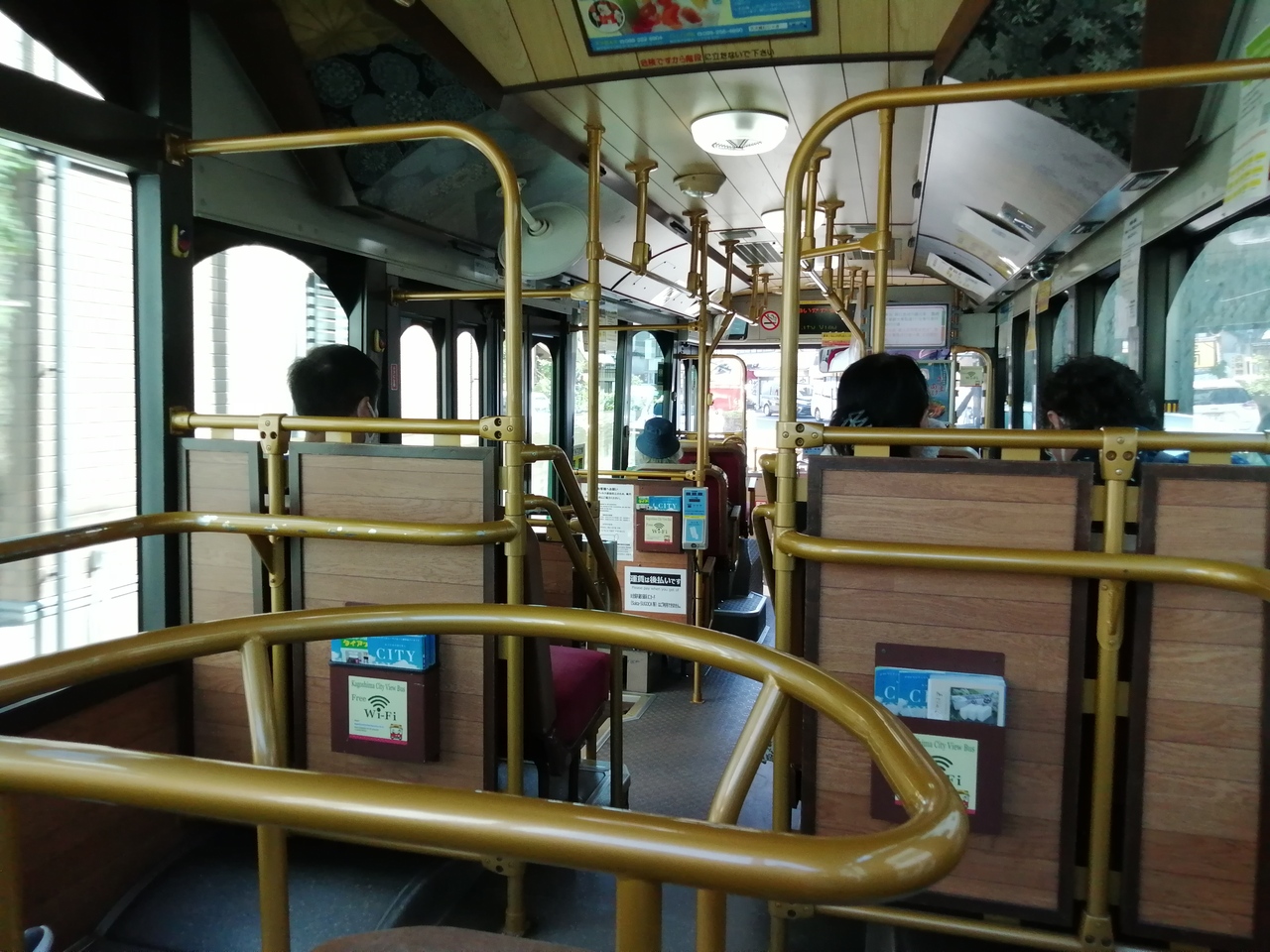 鹿児島県に出されていたコロナの蔓延防止措置のため運休していましたが、私が鹿児島にやって来た前日に解除、運行再開になり乗車することができました。ツイてます。乗車区間は「異人館(磯海水浴場)前→鹿児島中央駅」、料金は一律190円です。内装には木材が使われており、最後部は展望席という凝った造りです。