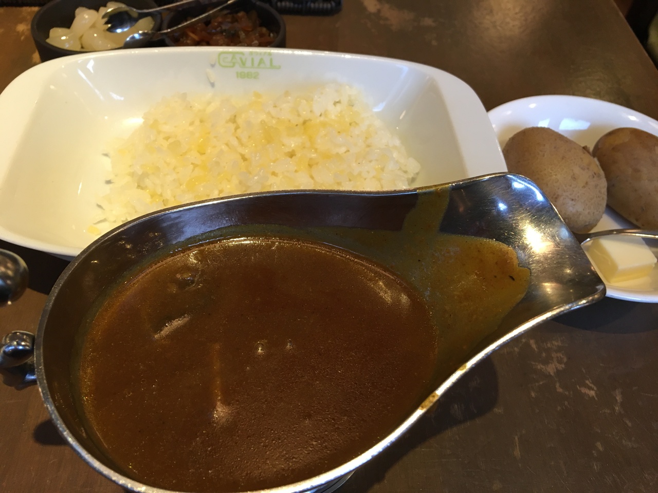 カレーと一緒にジャガイモが出てきました。熱々にバターを付けて食べました。カレーは中辛にしました。始め、甘いかなと思ったのですが、食べ進めるうちにピリリと辛さが効いてきました。ビーフのお肉がちょっと脂身が多くて残念でした。