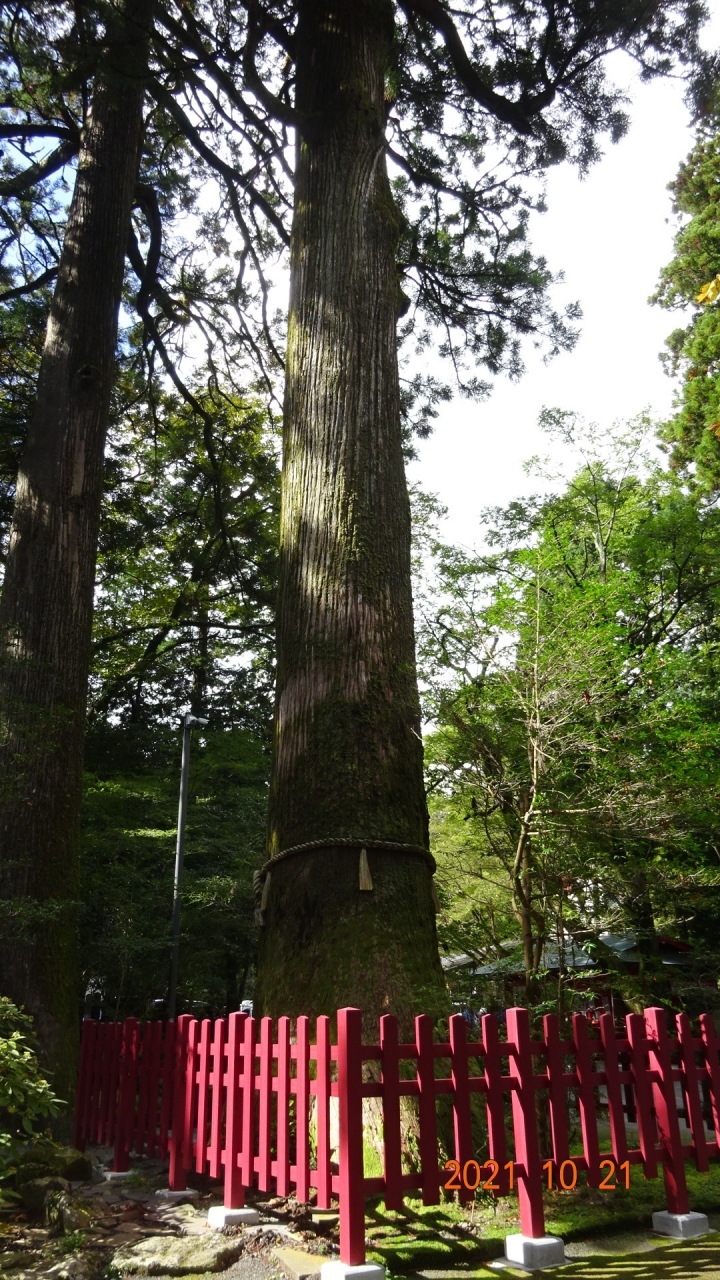 第四鳥居から見る参道の石段が、見ごたえが有りますが、ちょっと後ろを振り向くと「矢立のスギ」があります