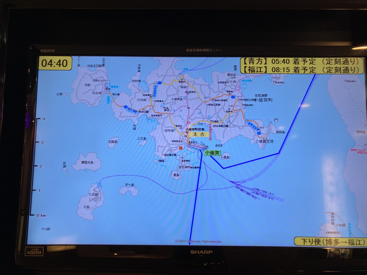 船内は期待以上に設備が整っていて、船旅を楽しむことができました。船内では、WiFiがつながっていましたが、ターミナルではWiFiがつながっていませんでした。夜遅い出港で、早くからターミナルで待っている方も多いので、ターミナルでも繋げて欲しいです。