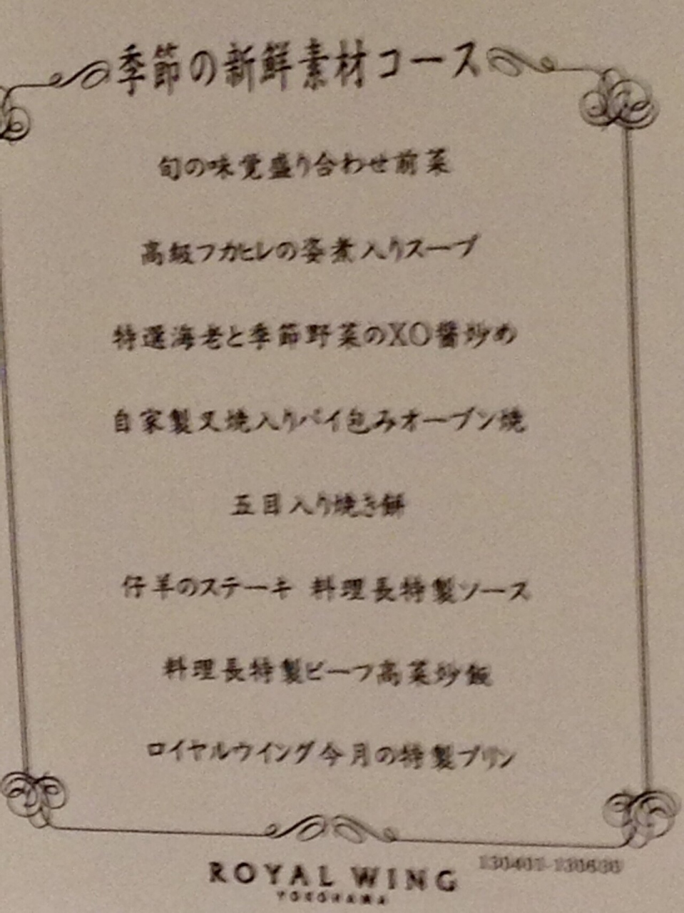 ロイヤルウイングの、ディナークルーズを利用しました。横浜港の風景を楽しみながらクルージングを楽しもうと思いましたが、コース料理だったため、外に出て景色を楽しむ時間が、ほとんどありませんでした。景色を楽しみたいなら、コース料理を選ぶより、中華バイキングを選んだ方が良いと思いました。