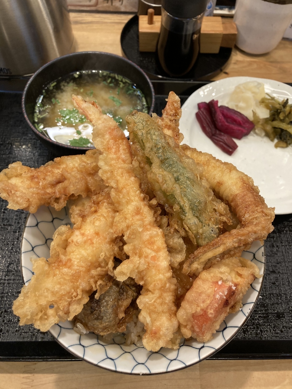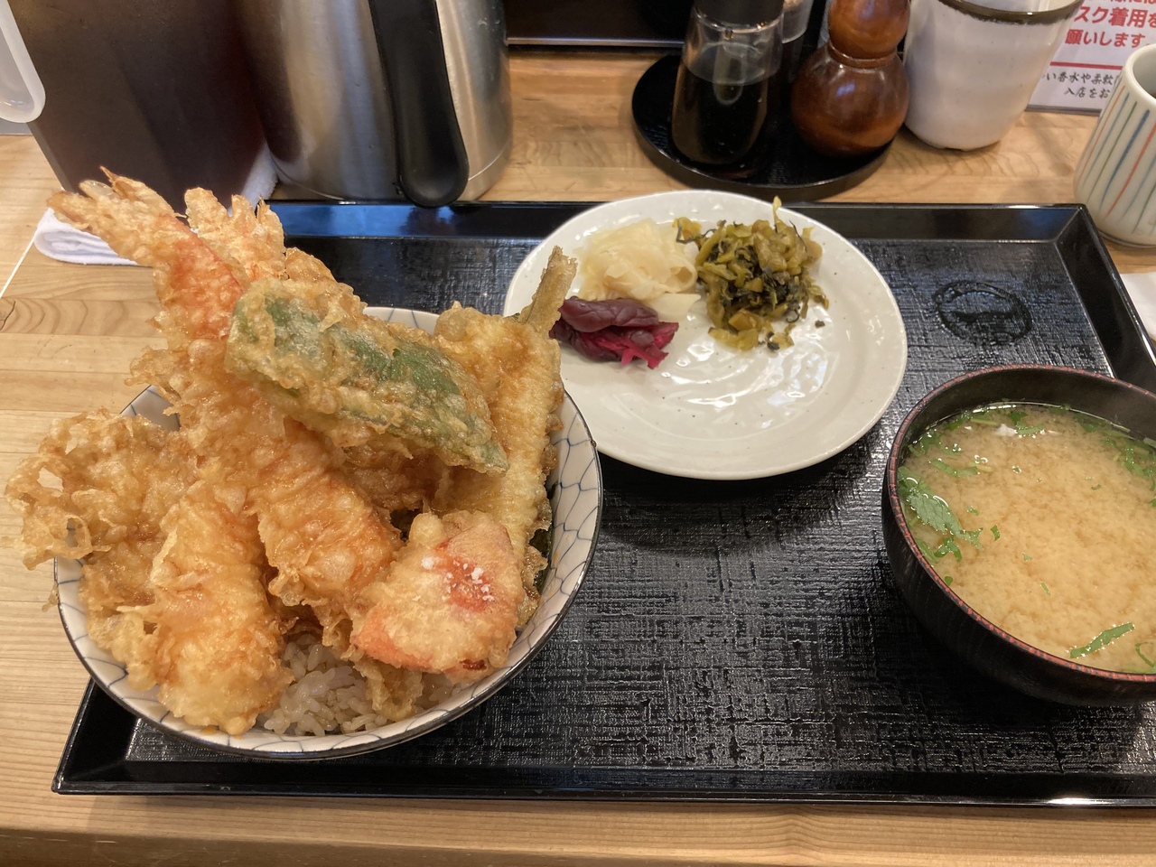 ランチの天丼1300円には海老が2尾、魚、鶏胸肉、野菜3種、海苔、卵。高く積み上がった天ぷらが食べやすいように、取り皿が添えてあります。カリッとした衣に、海老や野菜が甘くて美味。硬めに炊き上げたご飯にさっぱり目のタレがよく合います。ボリュームたっぷりで、粋な天丼です。