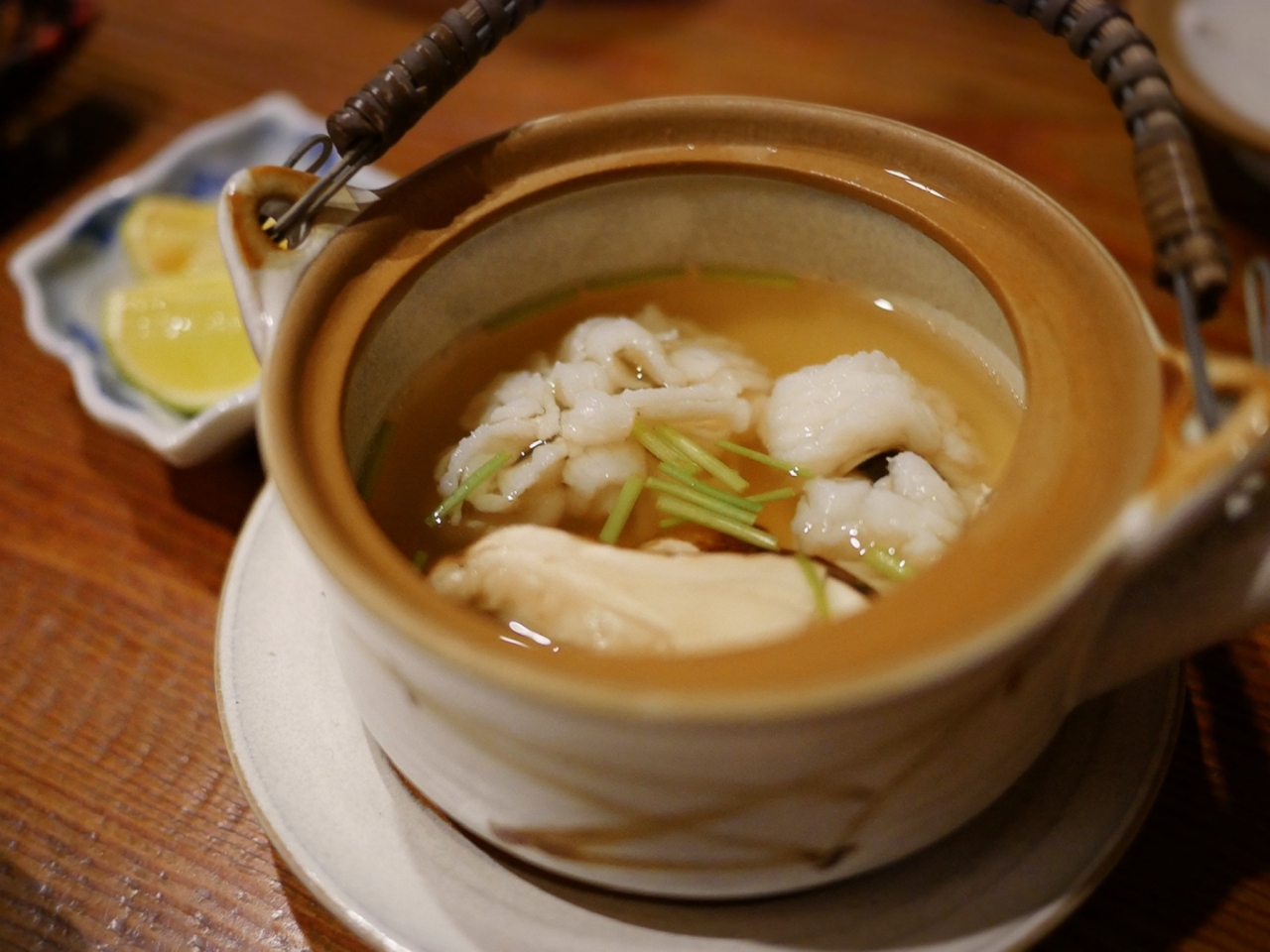 鱧と松茸の土瓶蒸し・・・出汁が上質で、香り高い一品。酢橘を絞って頂くと、口の中が幸せになります。