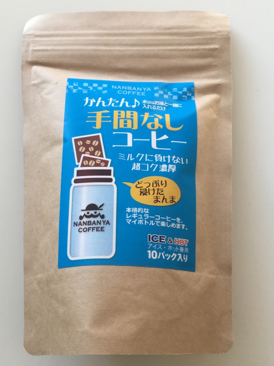 南蛮屋でコーヒー豆を購入した際見つけた「かんたん手間なしコーヒー」。文字通りパックをボトルに入れお湯を注ぐだけで、香りを感じるコーヒーが持ち運べる優れものです。しかもパックは入れっぱなしでも大丈夫。車での外出時は大変重宝しています。アイス、ホットでもオーケーです。