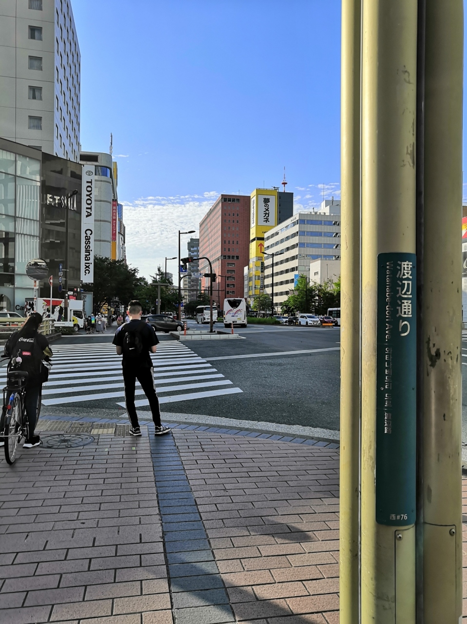 天神地区を南北に走る幹線道路です。天神地区を散策していればどうしても自然に通りかかることになると思います。歩道も十分広いですが、週末は人が多いのでごちゃついた感じはありますね。お店は多いですが、通り自体はまあそれほど特徴的ではないかも。