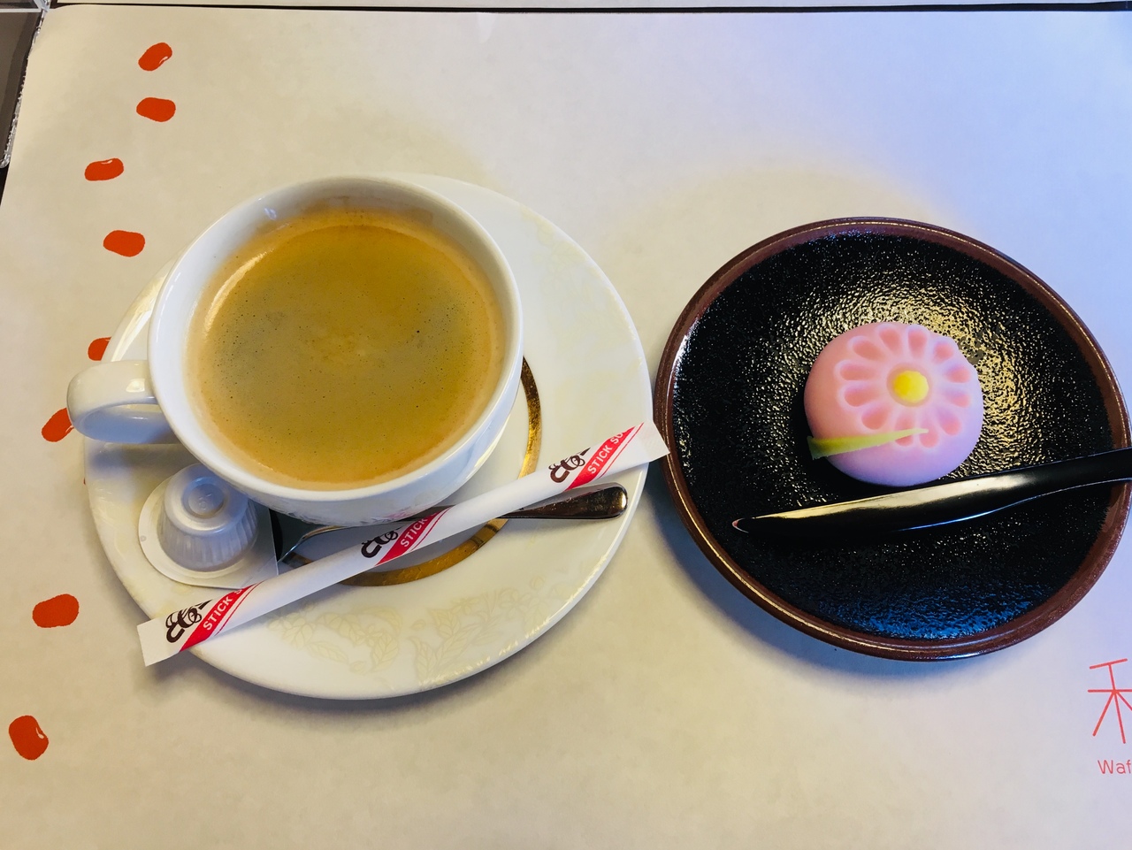 私は上生菓子とコーヒーのセット、同行者はクリームあんみつ、ソフトクリーム(あんこ添え)と各々注文