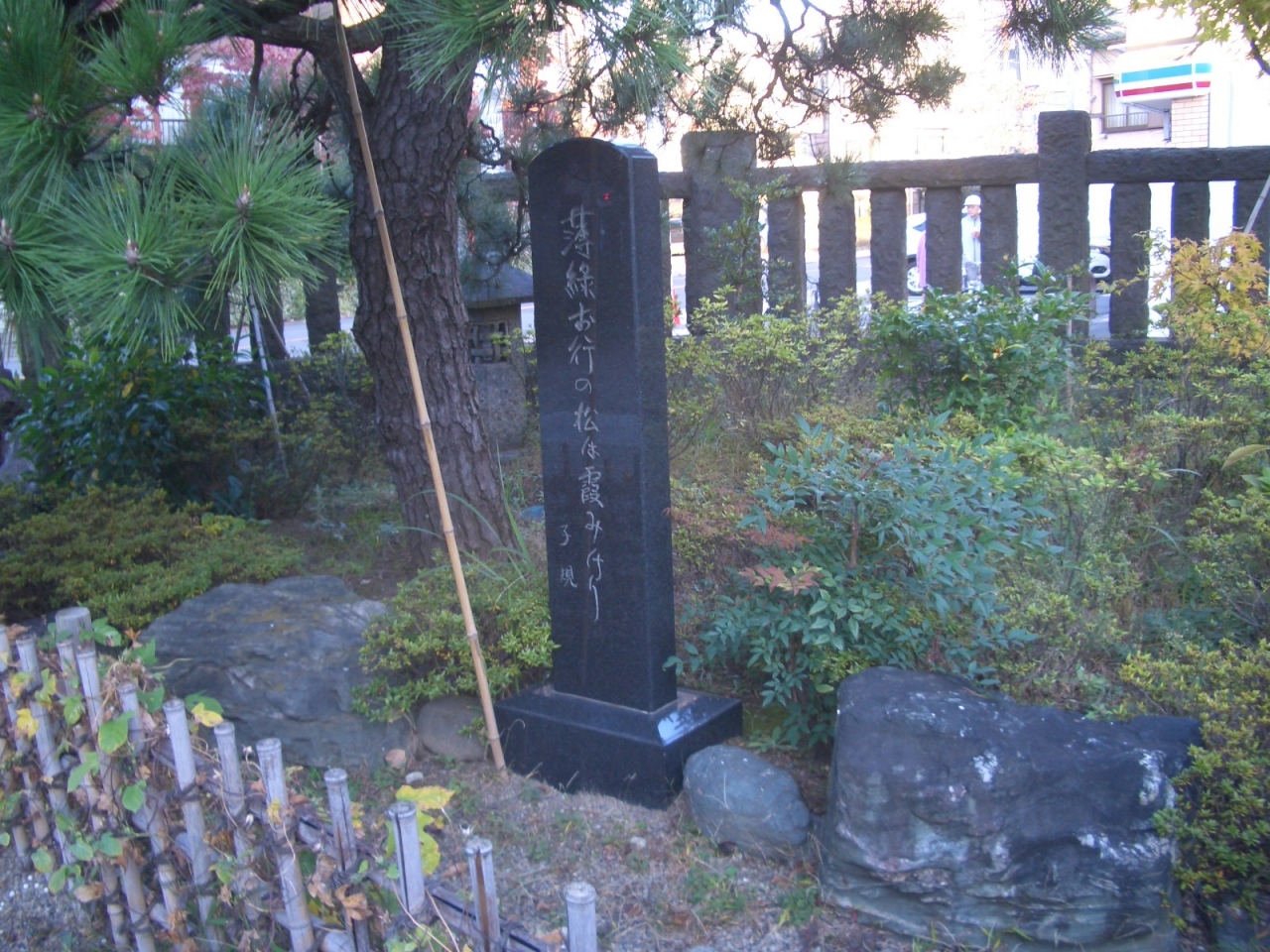根岸御行の松は、JR鶯谷駅から徒歩10分くらいのところ、西蔵院の境外仏堂(不動堂)の境内にあります。11月の早朝に近辺を散策した時に立ち寄りました。近所の方が清掃をしていました。御行の松は、江戸時代に広重の絵にも描かれた江戸名松の1つであったとのことです。不動堂の本尊は、初代の松の木の一部で作成されたものとのことです。子規の俳句の題材にもなっており、松の木の近くに句碑がありました。「薄緑 御行の松は 霞みけり」