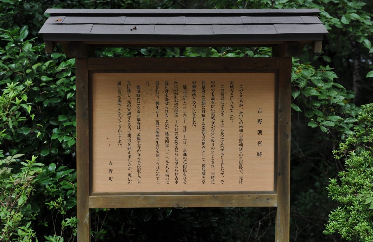 足利尊氏の京都奪還で吉野に落ち延びた後醍醐天皇が行宮と定めた場所だ。蔵王堂から南朝妙法殿の方向に急な石段を降りた辺りだという。天皇はここにあった実成寺を金輪王寺と改称し、行宮と定めた。吉野は山中で攻められにくいうえ、修験者勢力、楠木氏、北畠氏など南朝側勢力との連絡に便利だったことがこの地を選んだ理由とされる。京都奪還という捲土重来の地だったのだ。その後、実成寺は明治の廃仏毀釈で廃寺となり、跡地には南朝妙法殿が建立され、南朝の人々を弔う。蔵王堂から少し離れており、現地にはそんなオーラはないが、当時に思いを馳せると感慨深い。