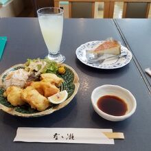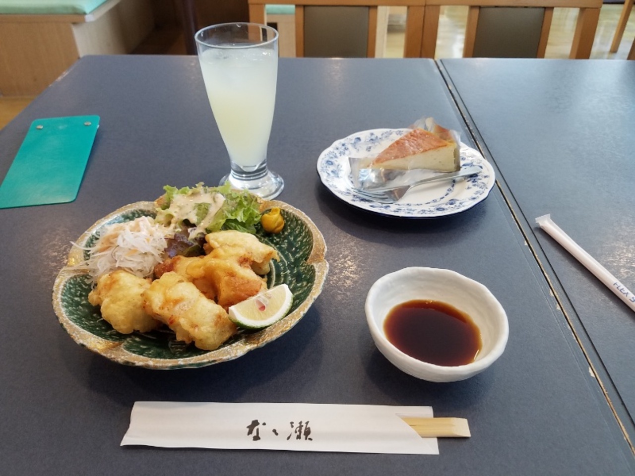大分空港の二階にある和風レストランです。午後からの用事の前に昼食を取りました。大分に来たらやっぱりとり天かなということでとり天の単品とかぼすジュースにチーズケーキを頂きました。飛行機を見ながら食事ができるので旅気分が高まりますね。