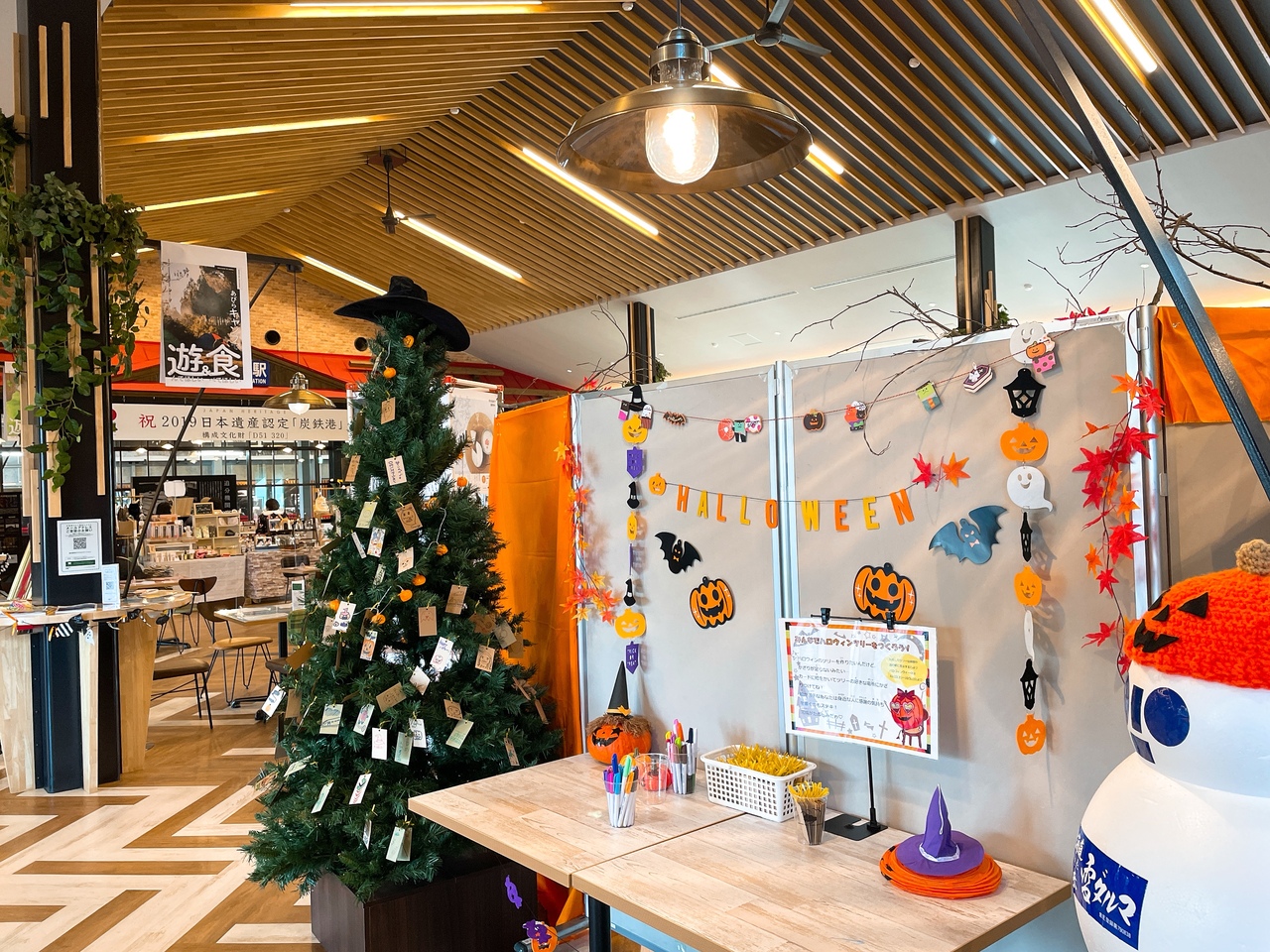ハロウィーンツリーをつくろうとかざりを手作りしてカードをツリーにかける楽しみがありました。館内は天井が高く三角なので広く感じました。