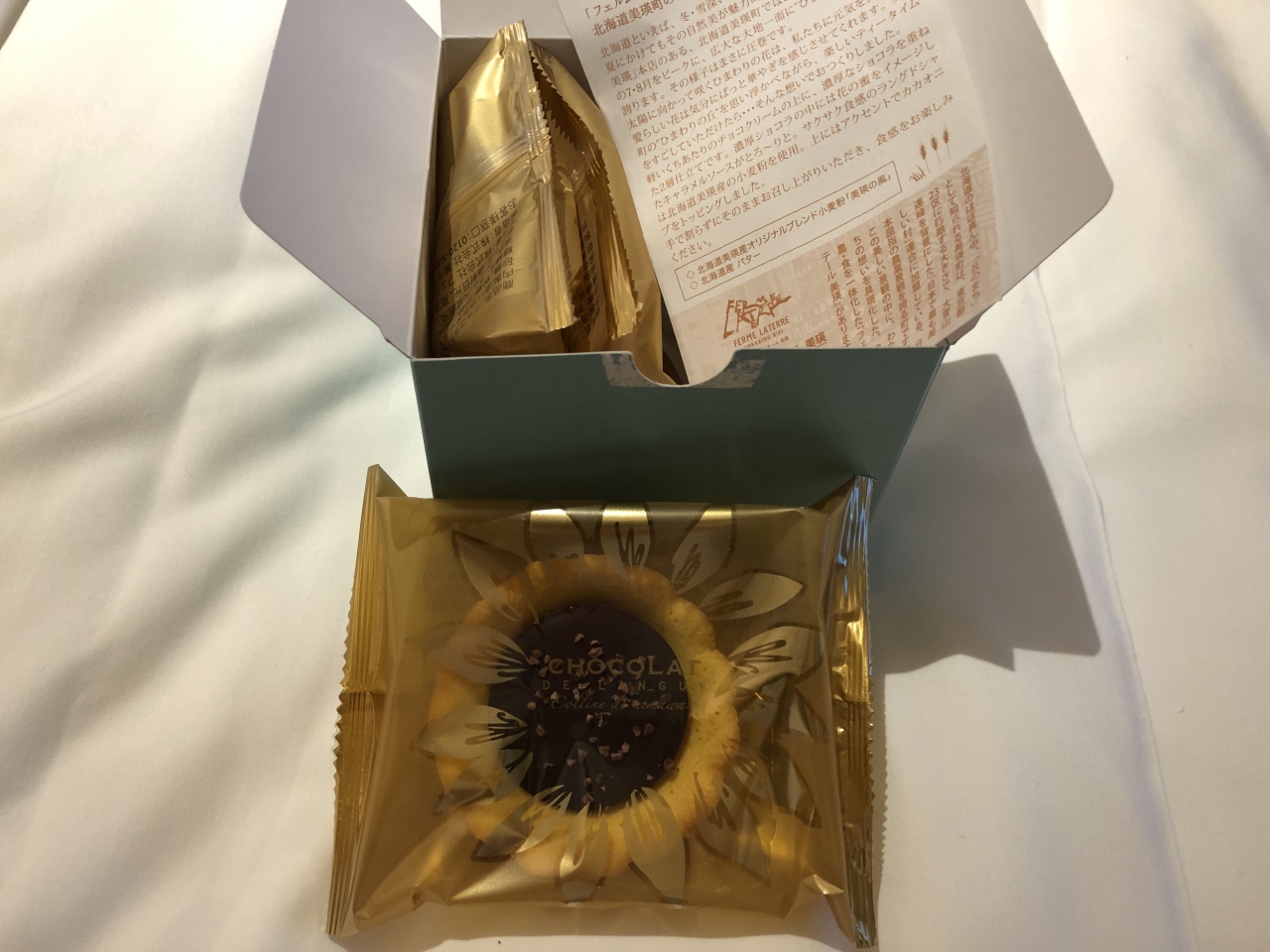 限定販売の食パンが人気というフェルム・ラ・テールでかわいいチョコレートクッキーを見つけました。北海道の大地を思わせるような大きなひまわりをかたどった「ひまわりの丘」は、サクサクっとしたラングドシャ生地が花びらに見立てられて、中にはチョコレートクリームやキャラメルが入っていて、一度でいろんな味を楽しめる楽しいスイーツです。食べるのがもったいないくらいかわいいです。