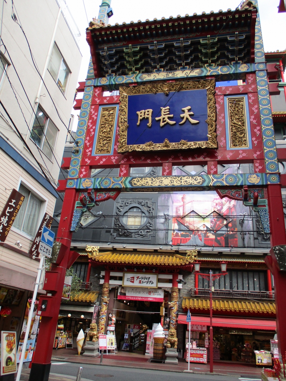 横浜中華街で食事を済ませた後、腹ごなしにぶらぶら散策していた時に通過した門です。周囲には中華料理のお店がたくさん並んでいます。この門は関帝廟に向かう通りにあるので、人通りも多くにぎやかな場所に建てられていた門でした。