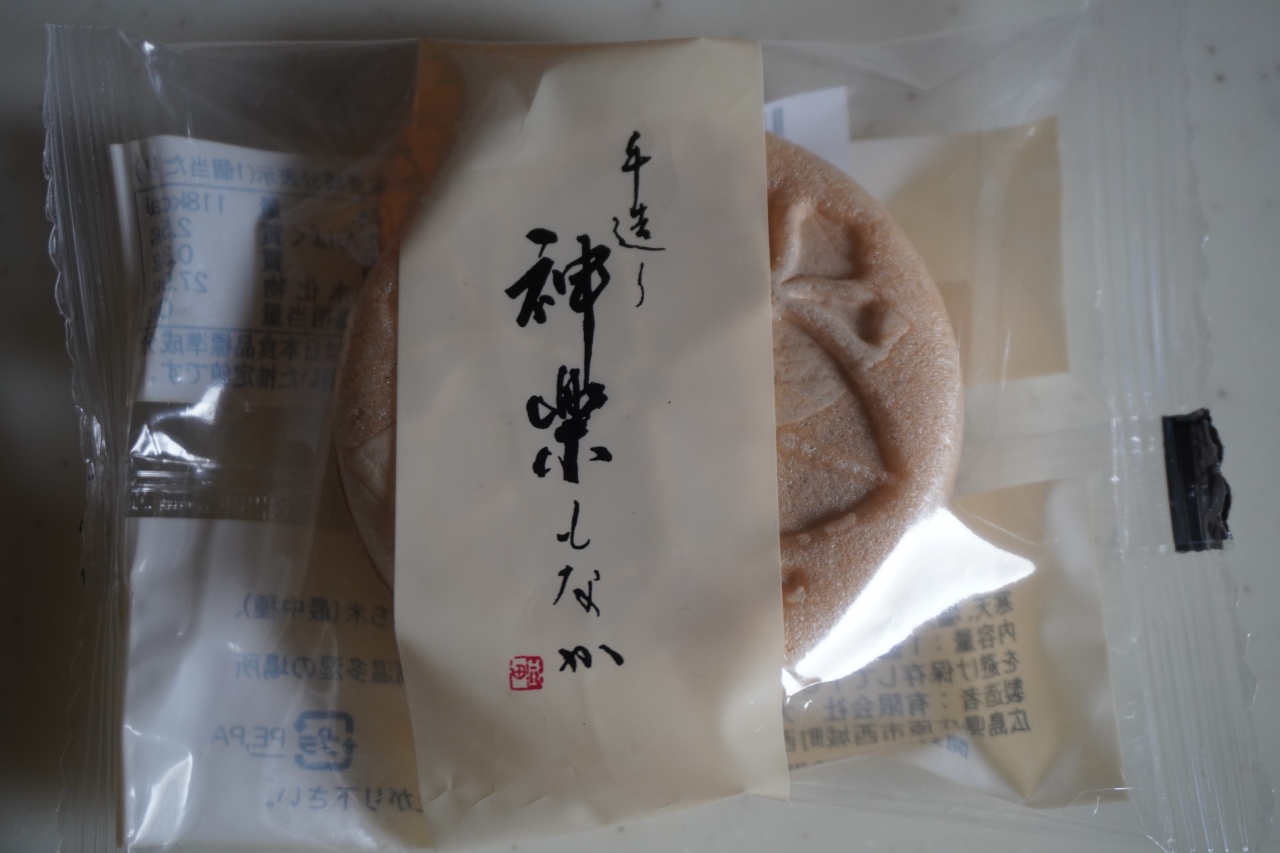 大国堂は、備後西城の老舗菓子屋さん。商品の種類もそれなりに多くて頑張っていますね。今回いただいたのは、神楽もなか。文様もなにか神楽の関係だと思いますが、くっきりしたデザインで悪くないですよね。皮はちょっと唇に付いたりして面倒くさいですが、餡子は艶のある甘さ。やっぱり、これは老舗の餡子ですね。
