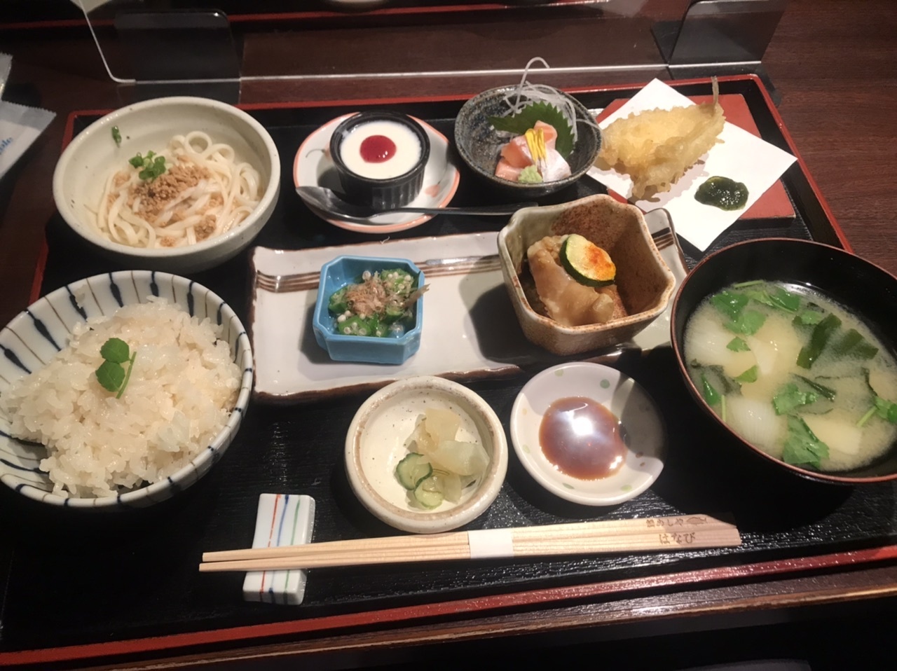 JR福島駅近くにある鯛めしの店です。ランチで利用。昼ははなび御膳1100円のみ。220円増しで鯛茶漬けセットが付きます。ご飯はおかわり自由です。小鉢や刺身、麺などもあり、お手頃価格で上品なな御膳です。駐車場ありません。