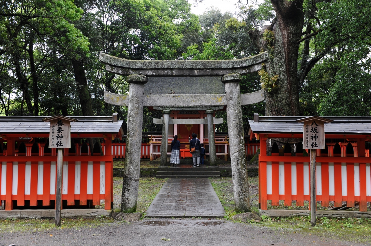 両神社とも宇佐神宮の境内摂社だ。八坂神社は明治時代の廃仏毀釈で消滅し、近くに石碑のみが残る弥勒寺の守護神だったという。京都の有名な神社と同じ社名からうかがえる通り、祭神はスサノオノミコトだ。同じく京都の「蚕ノ社」を連想する養蚕神社は宇佐市内にあった神社を1989年に合祀したもの。明治維新以降、全国で急激に生産が伸びた養蚕業がこの地でも盛んだったことがうかがえる。祭神はスサノオの姉である天照大御神だ。