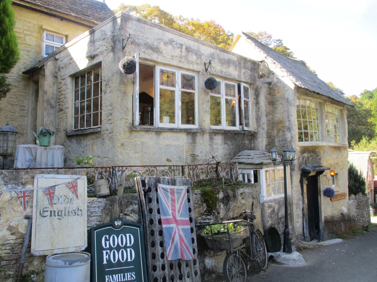 亀岡市の山間に突然現れるイギリスの村。駐車場はわりと広いです。売店がある入り口でランチの注文をすませて、敷地内に入りました。ここはもうまるでイギリスのコッツウォルズ。はちみつ色の建物が並んでいます。池もあります。先に食事をしてから敷地を散歩しました。猫もいました。アンティークショップや洋服のショップはスタッフの方に声をかけたら開けてくれるようでした。散歩は数十分程度したら十分なくらいの広さでした。