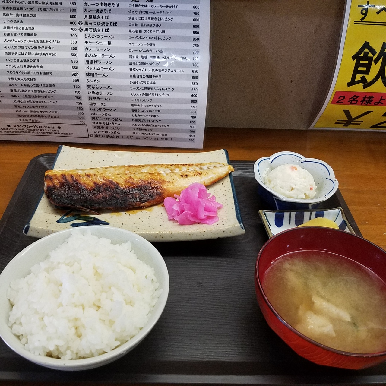 魚は大きめ、ポテサラと多目の漬け物もついてありがたいです。