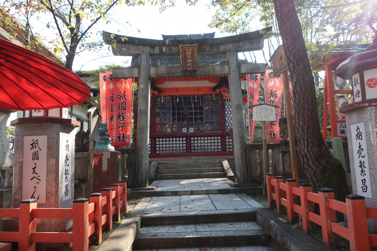 八坂神社の末社の一つです。西楼門をくぐり舞殿へ向かう途中に建っています。ご祭神は事代主神で、商売繁盛の神様として信仰されています。名前の通り、北向きに社が建てられています。祇園えべっさんとして親しまれているようですね。建立年は1646年のようです。