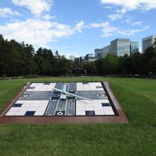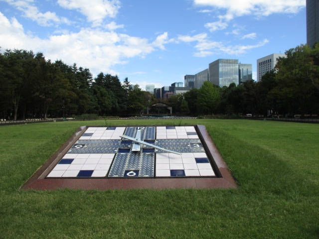 日比谷公会堂広場先の第二花壇傾斜の芝生内にソーラー時計があります。ソーラー時計は昭和58年3月に東京都が文化デザイン事業として時代に先駆け設置しました。十字形パネルに太陽電池が組み込まれ太陽の光を電気に変えて針を動かします。残念ながら訪問時は故障中の張り紙がしてあり動いていませんでした。第二花壇、日比谷ミッドタウンのコントラストが綺麗でした。白と青のさわやかな時計で芝生の緑に合っていました。