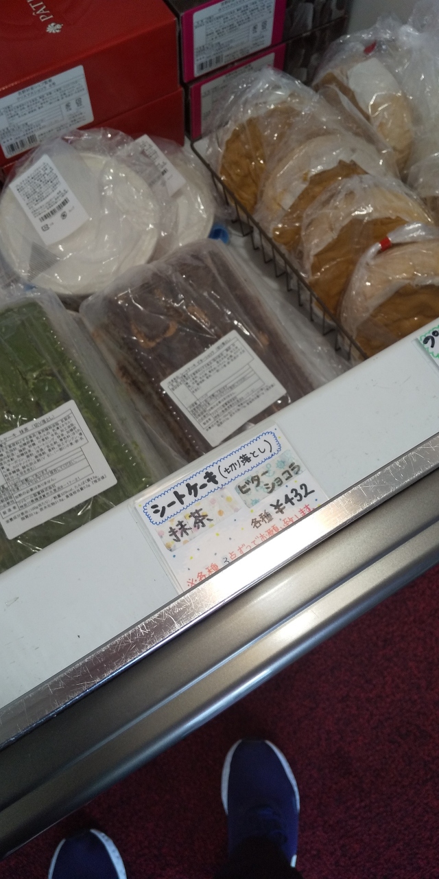 東京湾フェリーの久里浜ターミナルから近く、向かい側には温泉施設があり斜向かいにはカツやコロッケの工場直売所があります。トレーラーハウスみたいな店舗で工場の裏手にありますが、ショーケースには箱入りケーキしかありません。ほとんどが冷凍で解凍して食べるケーキ。しかしやすい