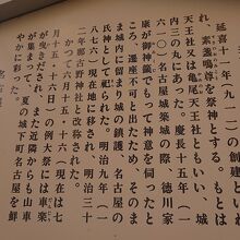 西暦911年創建とされる神社です。つまり、1000年以上の歴史を有するということ。10月中旬に訪問しました。案内板の表示によると、かつては、名古屋城の氏神として、三の丸に立地していたが、明治時代にこちらに移転したとのこと。歴史だけでなく、由緒もある神社なのだな、と感じました。