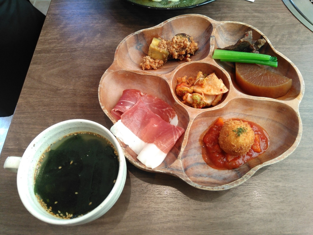 限定のランチセットがお得かと食べてみました。ビビンバにサラダや生ハム、煮物他、スープ、果物、デザートで食べ応えはありました。ビビンバは味も調整出来て美味しかったのですが、スープやおかず類は味が濃いめでした。食が細めになったお年頃、おかずなしで焼肉や単品とメニューをよく見れば良かったと反省の昼食でした。