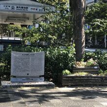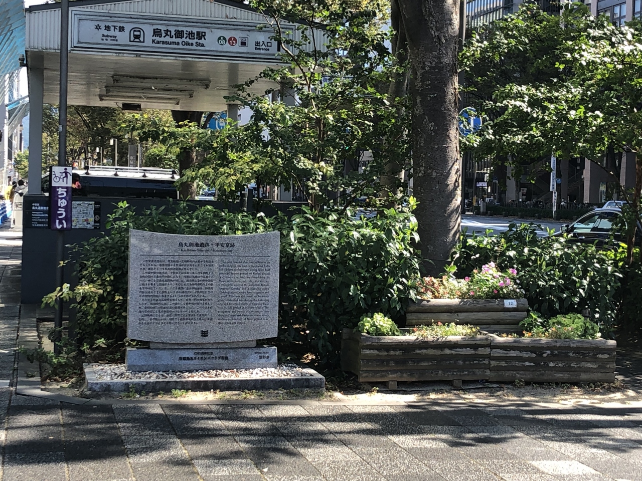 烏丸御池交差点の北東角、歩道の植え込みの中に石碑が立っています。普段このあたりは車で通りすぎるので初めて目にしました。まだ綺麗だったので新しいのかな。「烏丸御池」は京都市営地下鉄の烏丸線と東西線が交わる交通の要所、地下鉄を建設する際に遺跡の調査を行い色々発見されたみたいです。駅の地下通路には、発掘された埋蔵文化財が展示されています。
