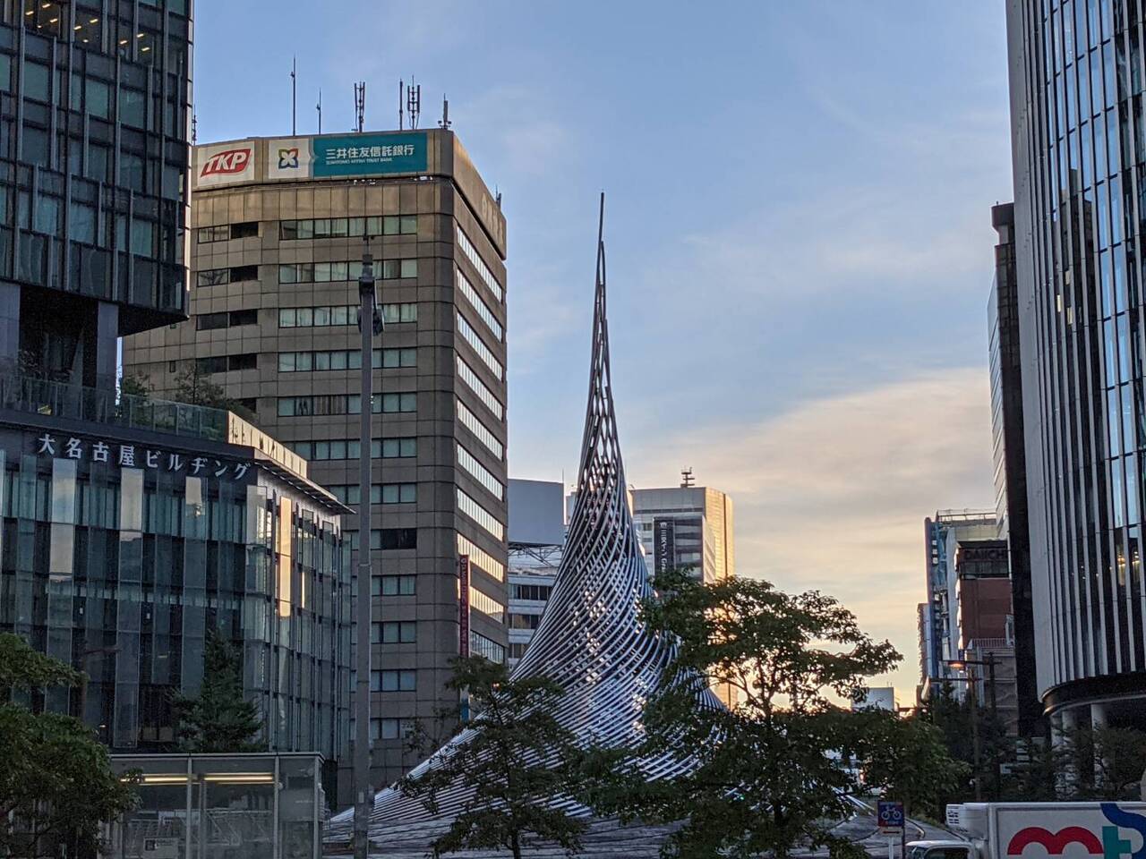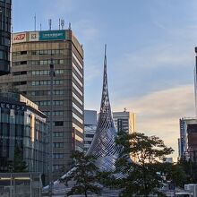 名古屋駅(桜通口)の前にある巨大な銀色の円錐型をしたモニュメントです。名古屋駅前ではシンボル的な存在でしたが、駅前再開発により解体・移設が決まっているようです。まだ、解体されていなかったので、その勇姿を見ることができました。思っていたよりも大きく立派なモニュメントでした。