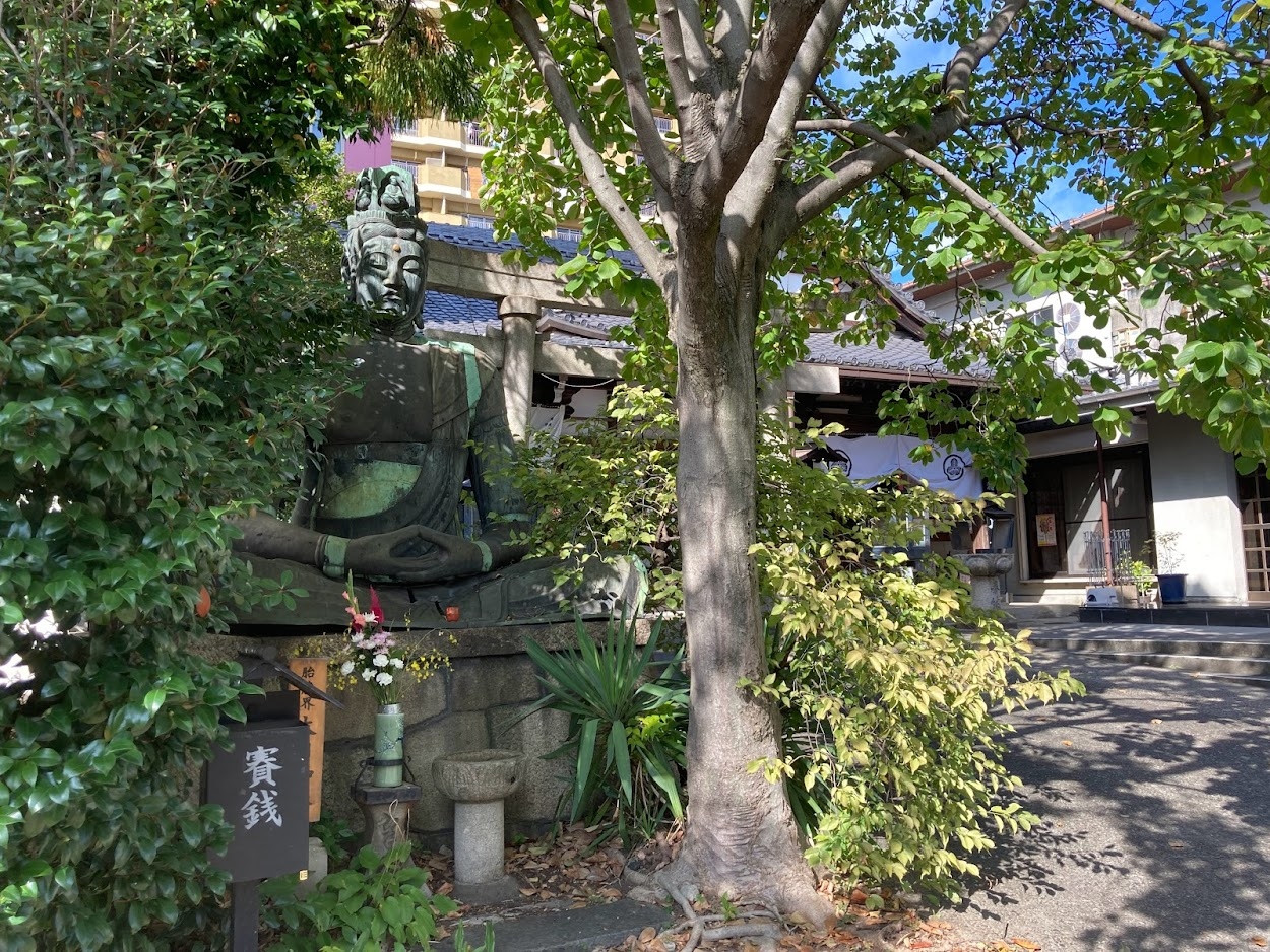 太平洋戦争の戦火にみまわれ、境内の大日如来像は、戦火の凄まじさを物語るように、あえて傷を負ったままの状態で、今も見守ってくれています。