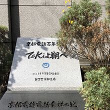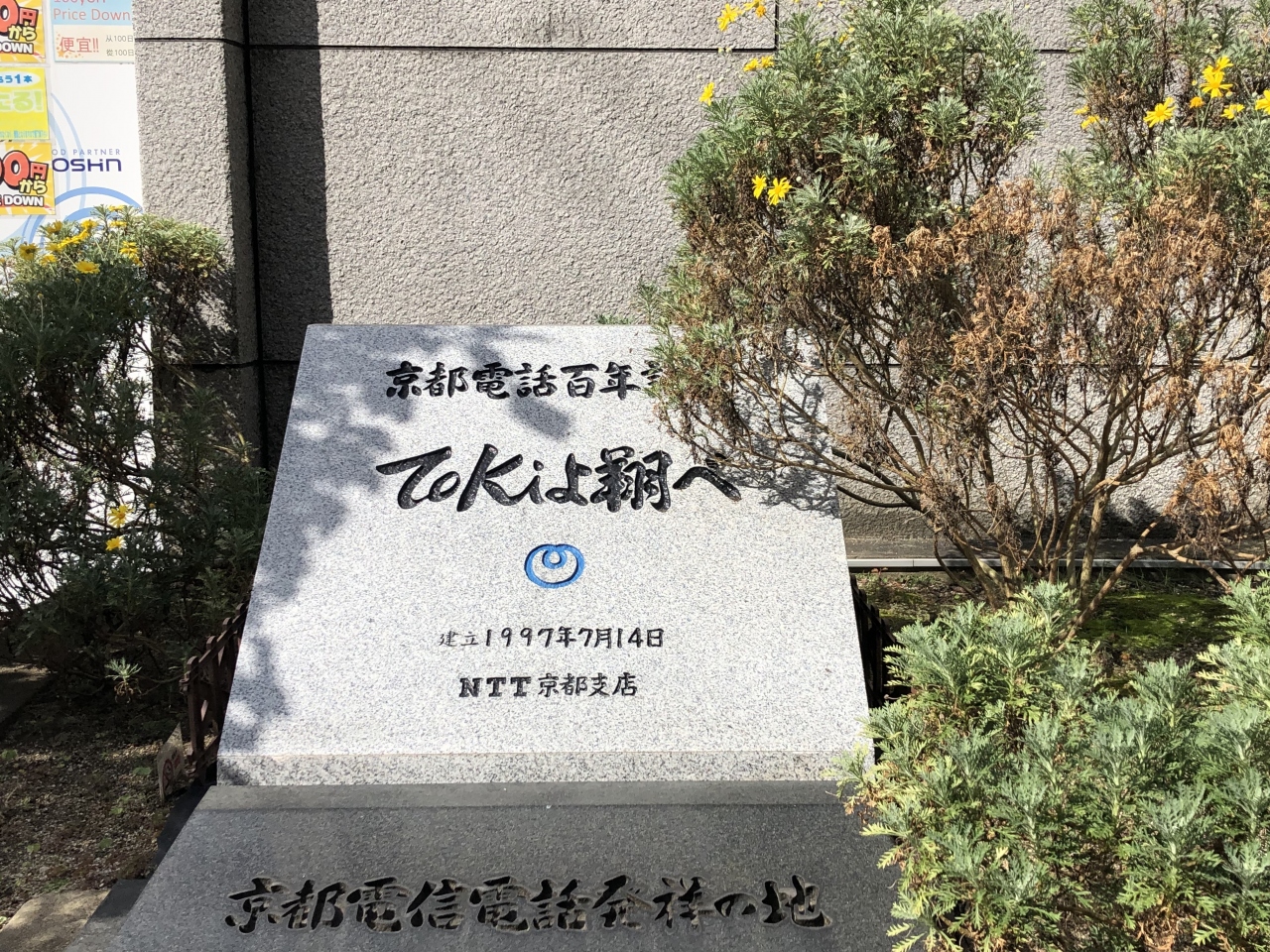 三条通東洞院北西角、NTT西日本京都支店のビルの敷地内に、「京都電信電話発祥の地」「京都電話百年記念」と書かれた碑が二つ並んであります。1997年に造られてタイムカプセルが埋められ、20年後の2017年5月27日(土)に記念式典を行い開封したそうです。何が入っていたかはわかりません。